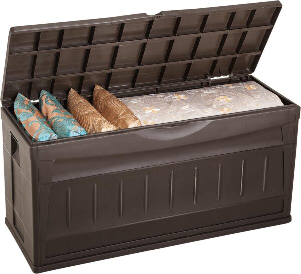 “RIMAX” Deck Storage Box offers a spacious interior perfect for organizing and storing belongings. Interior capacity is 83.2 gallons. Durable resin material is easy to clean as well as rust, stain and scratch resistant. Its modern design is perfect for indoor or outdoor use, and 2 casters make it easy to move this unit. It also features 2 side handles and a lockable lid (lock not included). Assembly required.