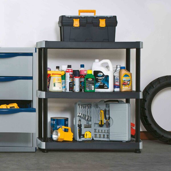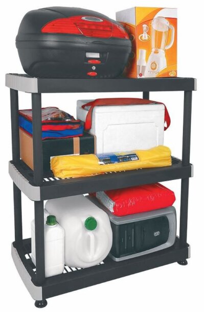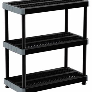 “RIMAX” Heavy Duty 3-Tier Storage Shelving Unit made from polypropylene resin. Open shelves allow plenty of room for storage. Heavy-duty Resin construction is rust, stain and scratch resistant. East Assembly, no tools required. Holds up to 99 lbs. per shelf when evenly distributed, and can be anchored to a wall. Assembly required.