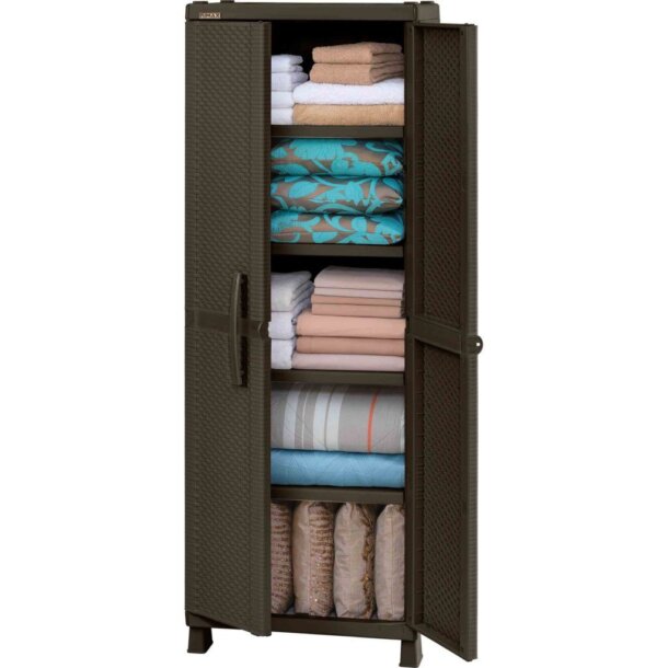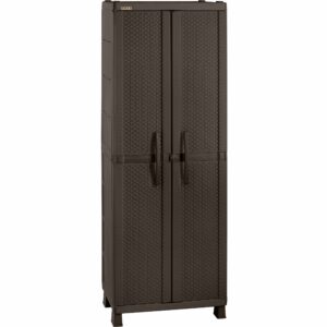 “RIMAX” Large Cabinet made of resin with a beautiful rattan look, features 4 adjustable shelves that can withstand up to 55 lbs. (25 kg) each when easily distributed. It is easy to assemble, move and clean. The durable resin material is stain and scratch resistant. It offers plenty of space for storage and the external handles have a hole for padlock, increase security of the contents. Its modern design is perfect for any space. Assembly required.