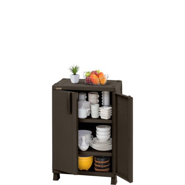 “RIMAX” Compact Cabinet made of resin with a rattan look, features 2 adjustable shelves that can withstand up to 55 lbs. (25 kg) each when easily distributed. It is easy to assemble, move and clean. The durable resin material is stain and scratch resistant. It offers plenty of space for storage and the external handles have a hole for padlock, increasing security of the contents. Its modern design is perfect for any space. Assembly required.