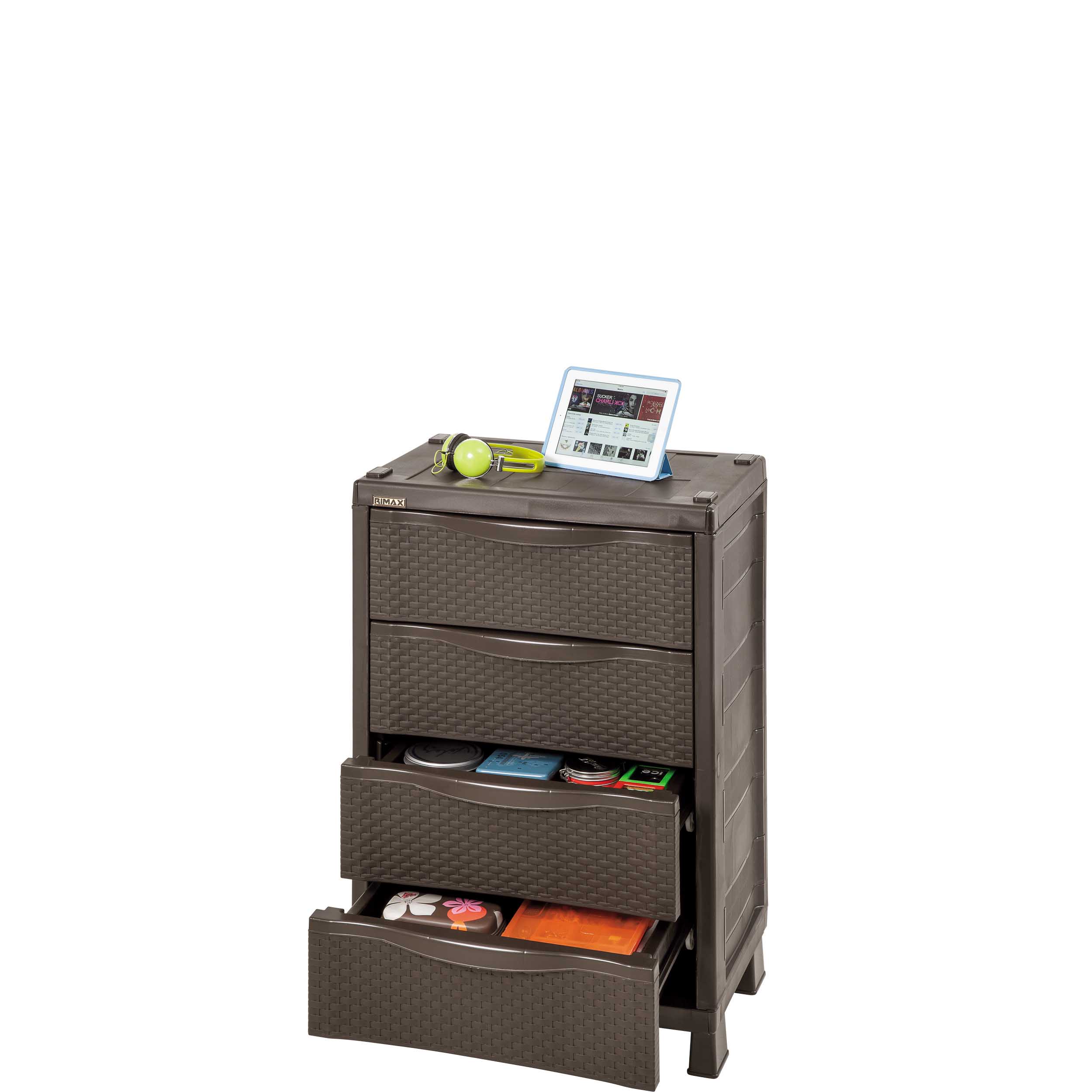 “RIMAX” 4-Drawer Cabinet made of resin with a beautiful rattan look. It offers a large storage capacity with 4 spacious drawers. It is easy to assemble, clean and move. Durable resin material is stain and scratch resistant. Assembly required.