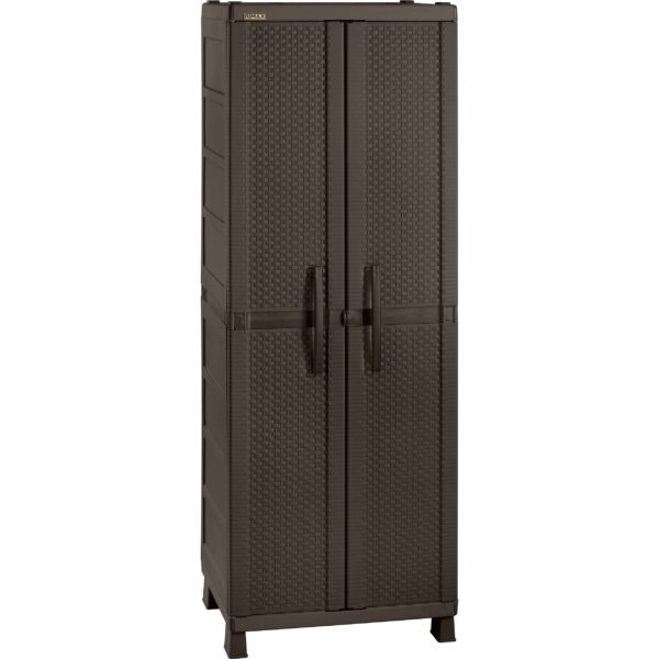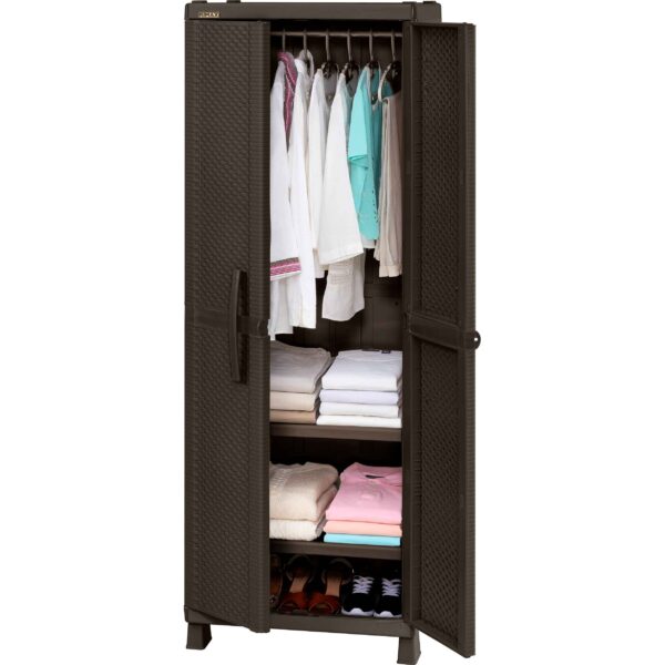 “RIMAX” Large Wardrobe Cabinet made of resin with a beautiful rattan look. It has 2 adjustable shelves that can withstand up to 55 lbs. (25 kg) each when distributed evenly. It features a sturdy aluminum tube, offers plenty of space to hang clothes and includes 6 RIMAX clothes hangers. It is easy to assemble, move and clean. Durable resin material is rust, stain and scratch resistant. The external handles feature a hole for padlock, increasing security of the contents. Its modern design is perfect for any space. Assembly required. Overall dimensions: