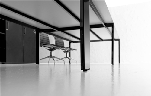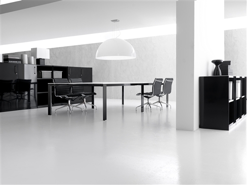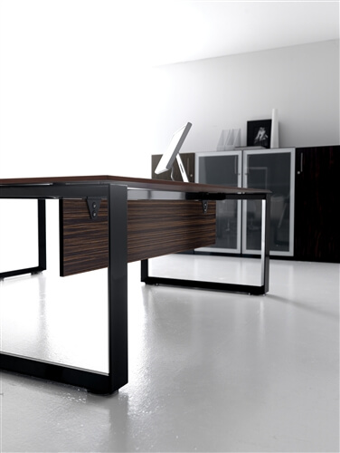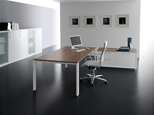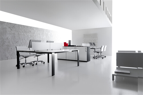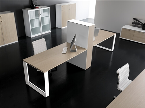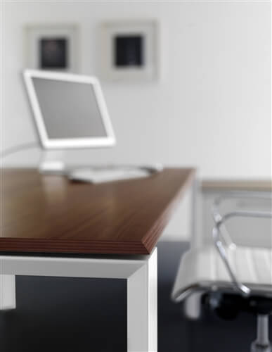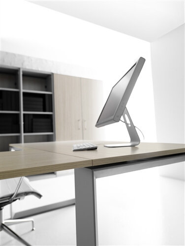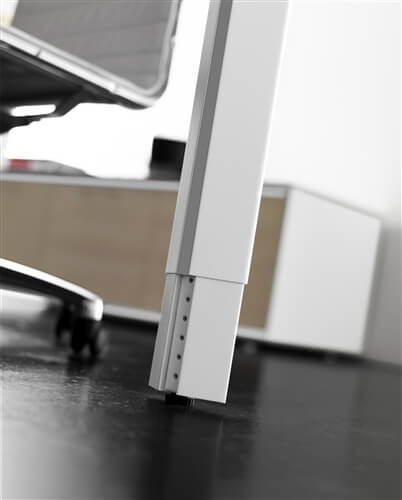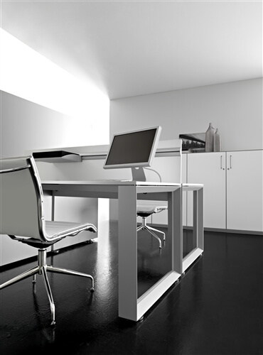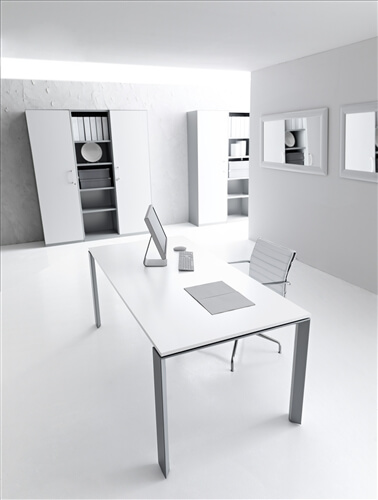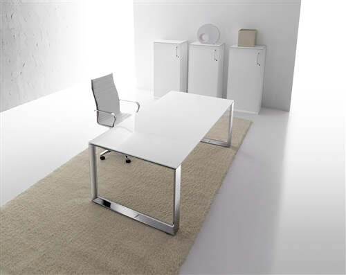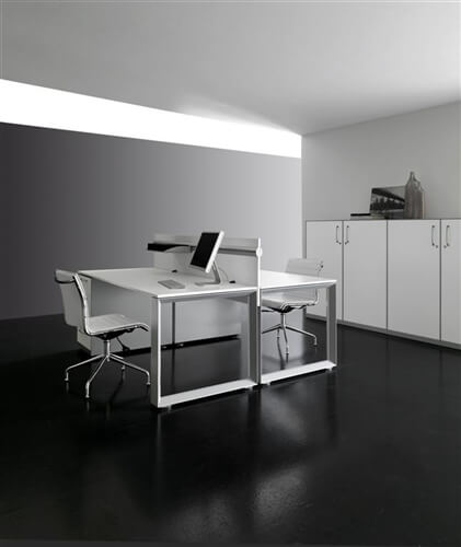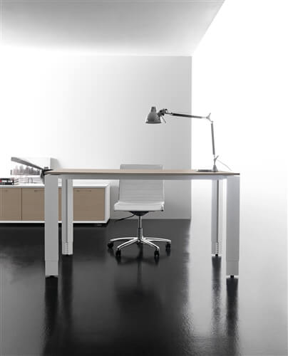 The structure of the desks is composed of 2 sheet steel panels 15/10 mm thick, closed ring shaped leg or “U” shaped leg, with an aluminium profile in the inside. Each panel includes 2 adju- stable height feet fitted with supports perfect for the levelling of the structure. All the ring shaped legs include the possibility to insert a panel in glass or veneer finishing. This system also inclu- des a “U” shaped leg adjustable height leg from 74cm to 94 cm through a telescopic mechanic system. The rectangular steel beams, 2 for the desks and 4 for the 160cm deep, 50X25 mm 15/10 thick, are fitted to the panels on particu- lar supports fixed with a fast expansion hanging system. The system also includes the sharing of the panels through the beams hanging system on each side. The available colours are: chro- mate, white, shiny black and silver. All the tables are available on “U” shaped leg.