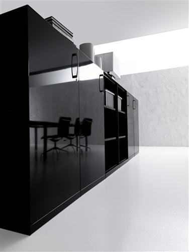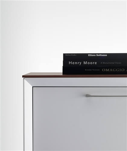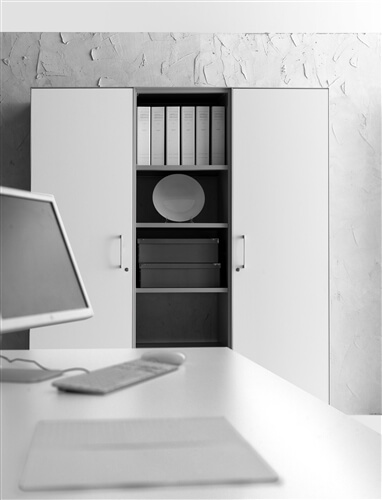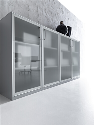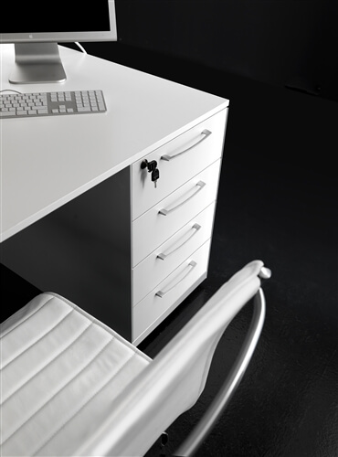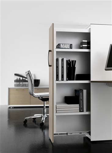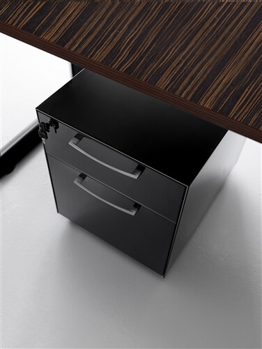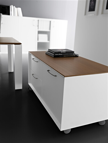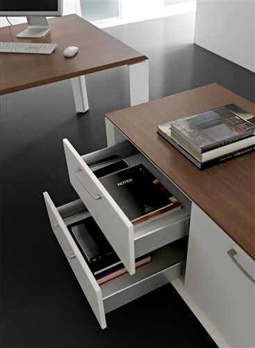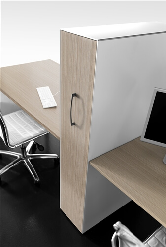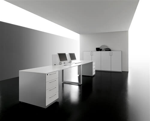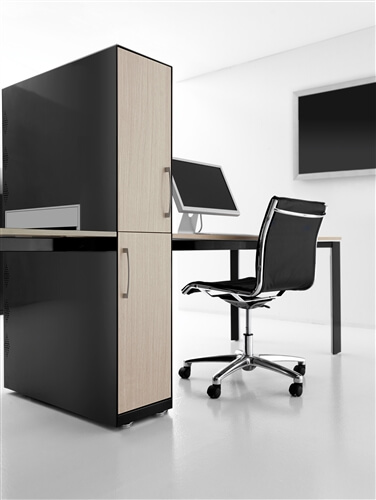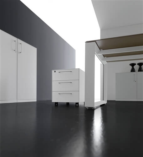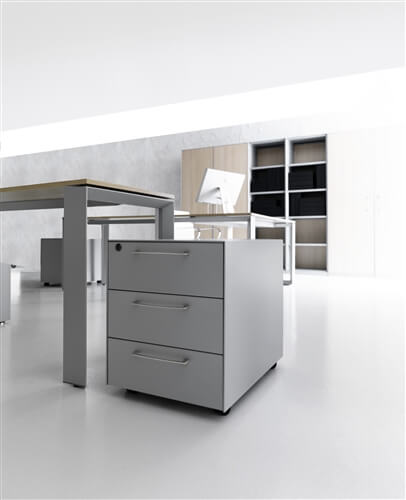 The system includes a range of supporting me- tal cabinets that replace one of the legs. They can be both central or final and have different functions: cm 80 deep 4 drawer pedestal, pede- stal + open cabinet, single (low) and double (top) CPU holder, extractable cabinet, mobile returns with 3 modules.