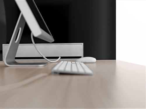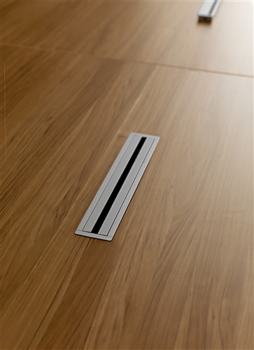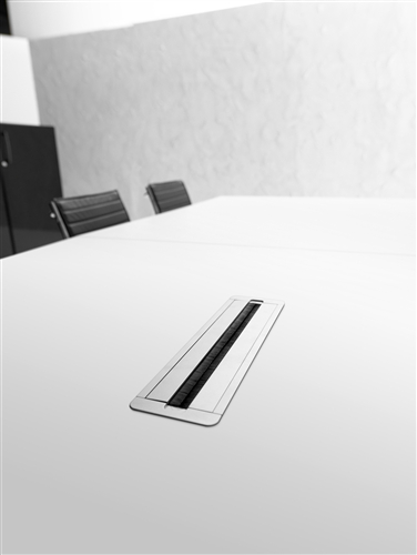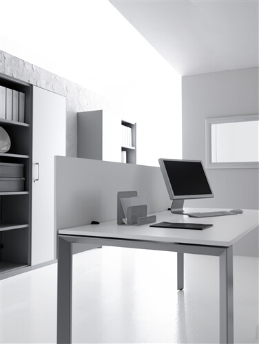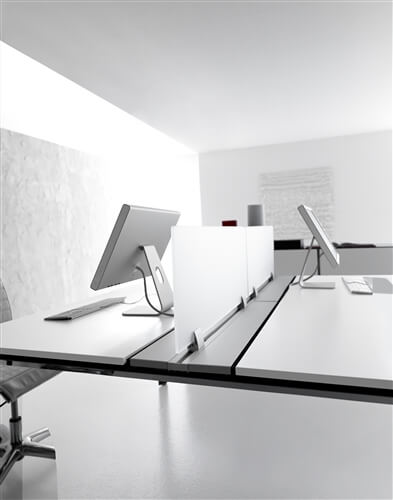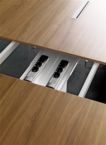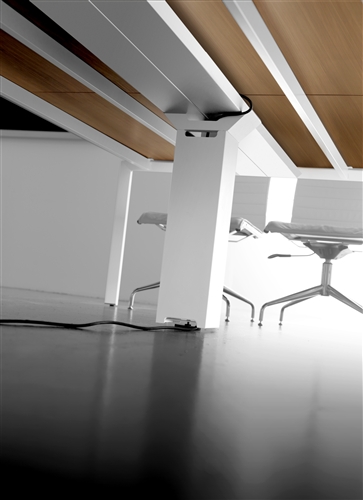 The bench tables are only available in 160 cm deep and they include an electrification central bar that supports the metacrilate dividing scre- ens also includes aluminium tilting doors for ea- sing access to the cable management system.
