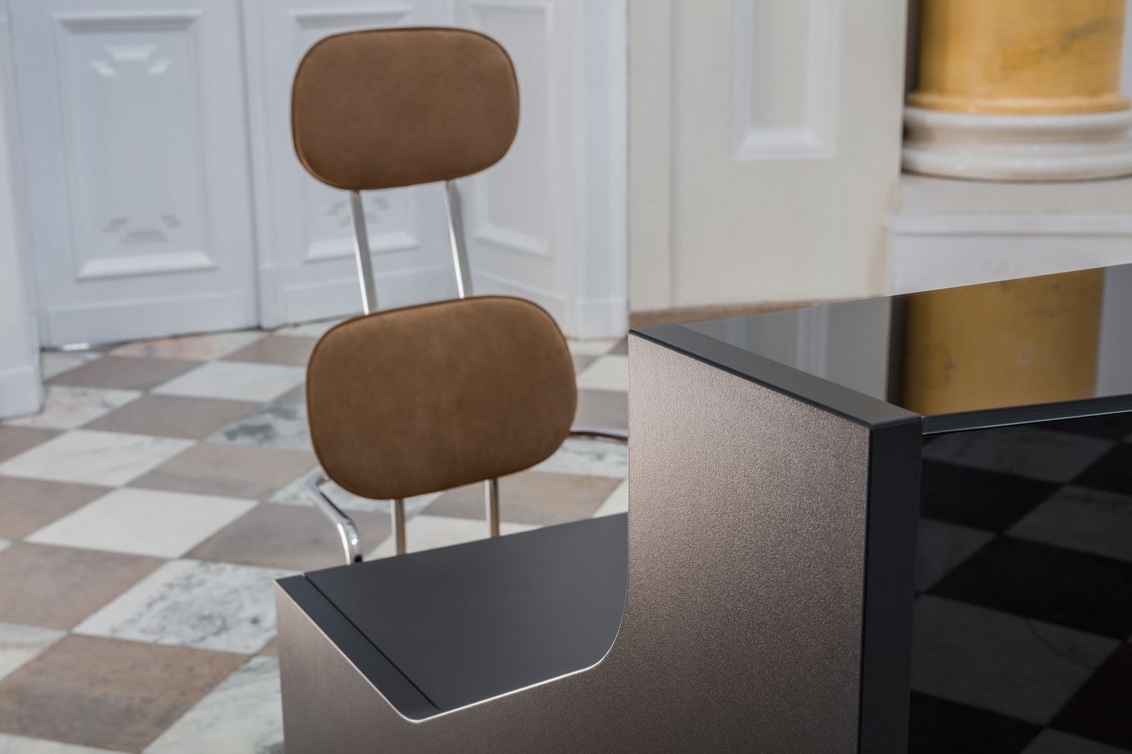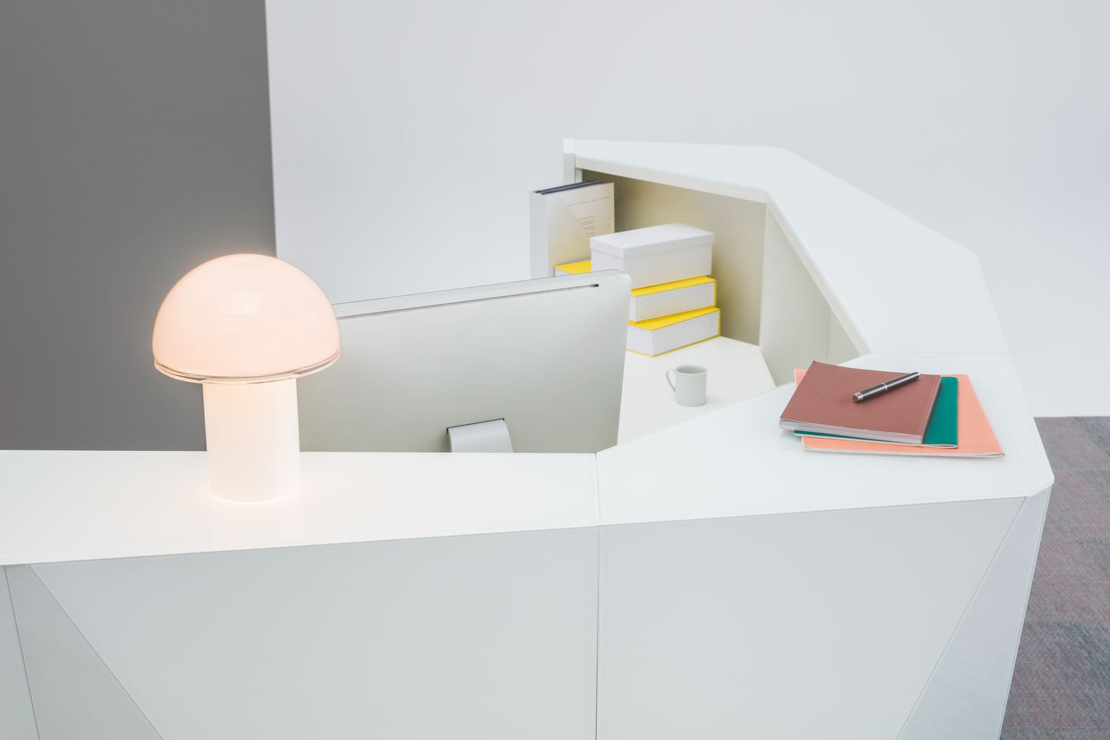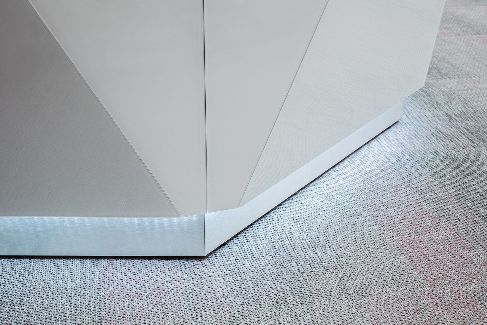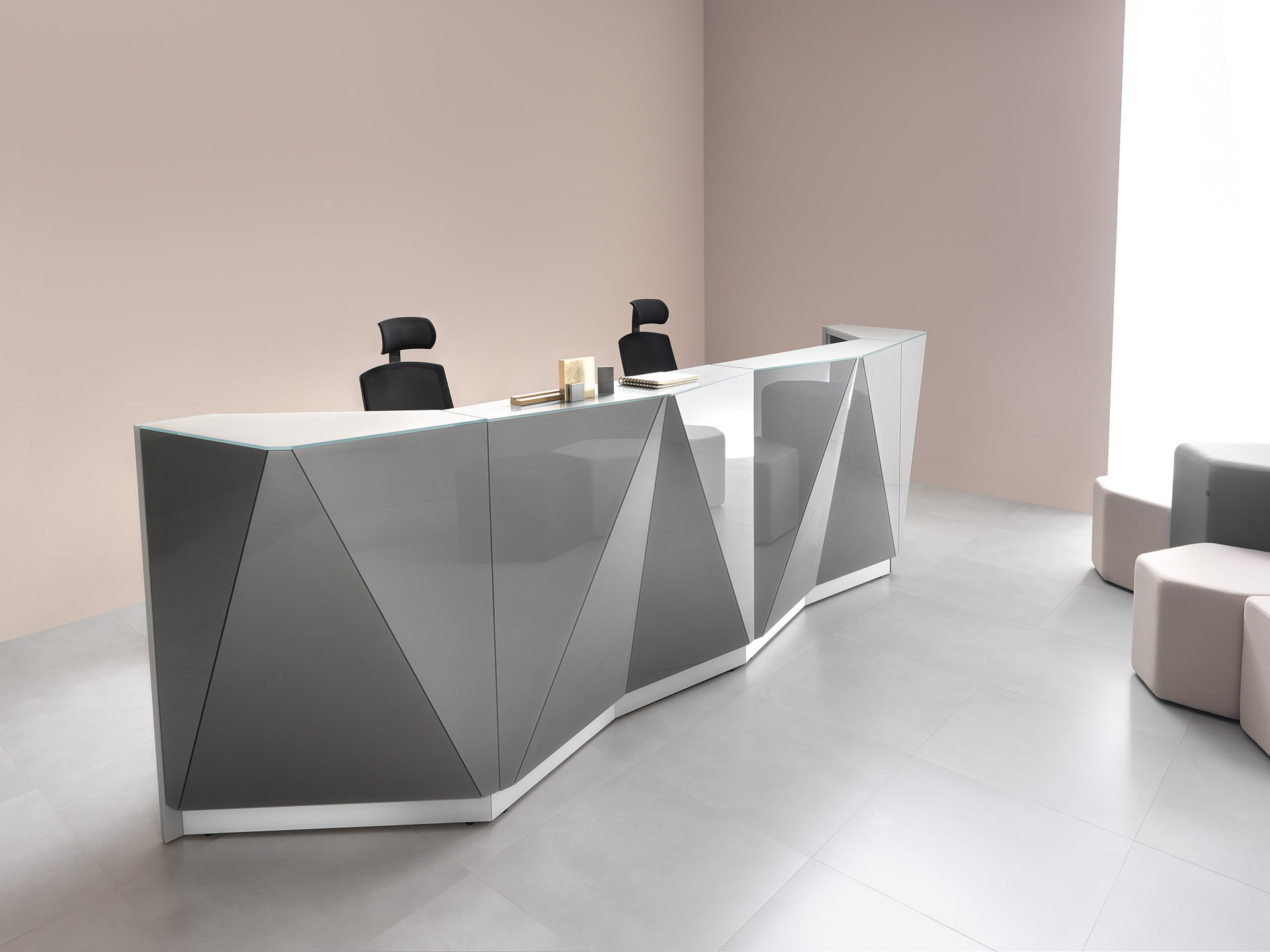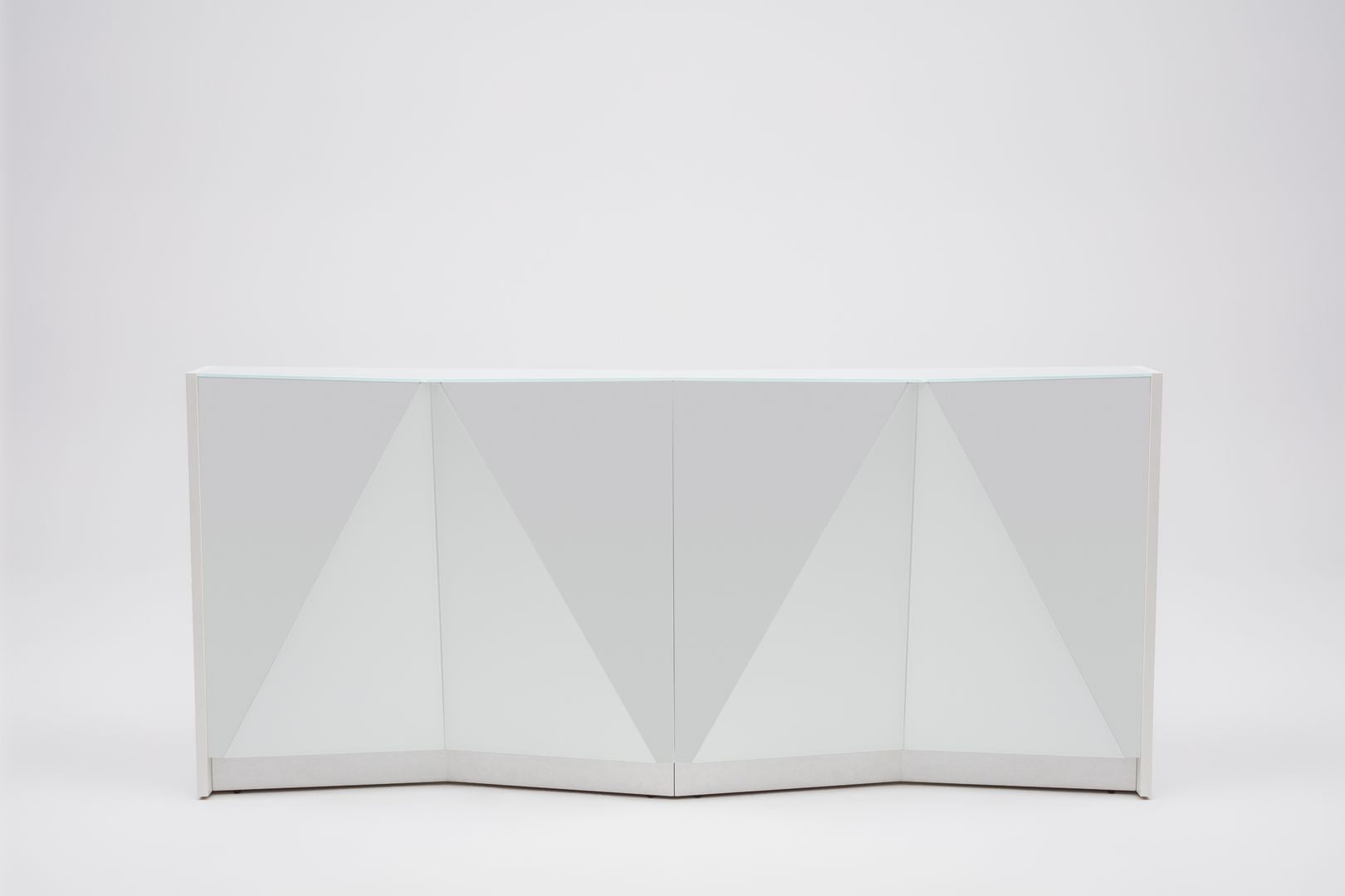 Evoke the feel of nature in your spaces with this reception desk inspired by the shapes of the Alps. Crafted not only to make guests feel welcomed but also to suit the demands of modern reception areas, integrates the ALPA functionality with grace and timeless design. Luxurious and casual at the same time, a modular reception counter ALPA is available in various arrangement and colors. The glittering front made of glass enlivens every room despite its neutral colour – aluminium, black or white. Minimal aesthetic and clean lines are the most striking features of this receptions desk that are highlighted by an illuminated kick plate.