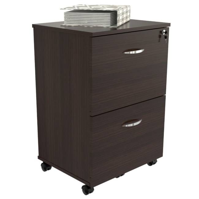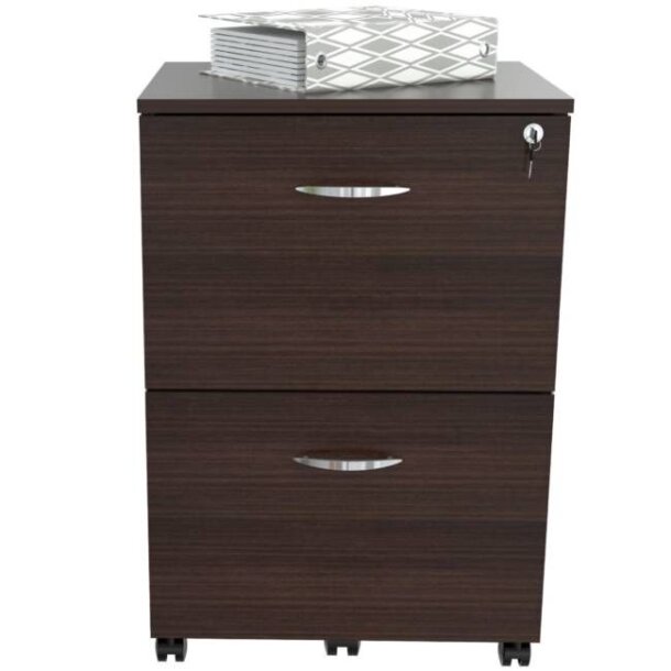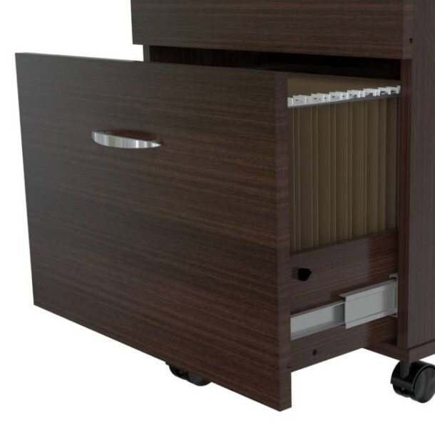 Mobile drawer file, with a 1mm edge banding on front edge of file, drawer front panel and top. Open storage are, one file drawer with chrome metal handle and metal sides. Accommodates letter size files, five 2″ caster for easy mobility and added safety. Laminated in double-faced durable melamine which is stained, heat and scratch resistant, finished in Espresso-Wengue, solid engineered wood.