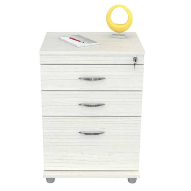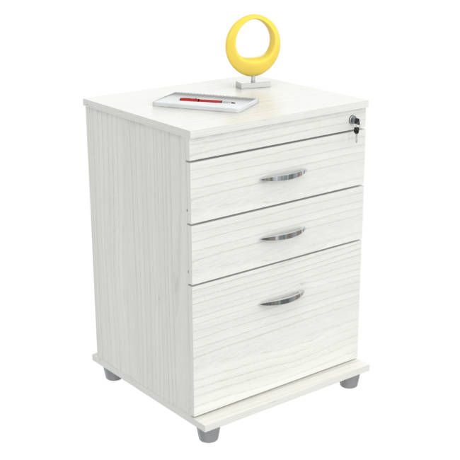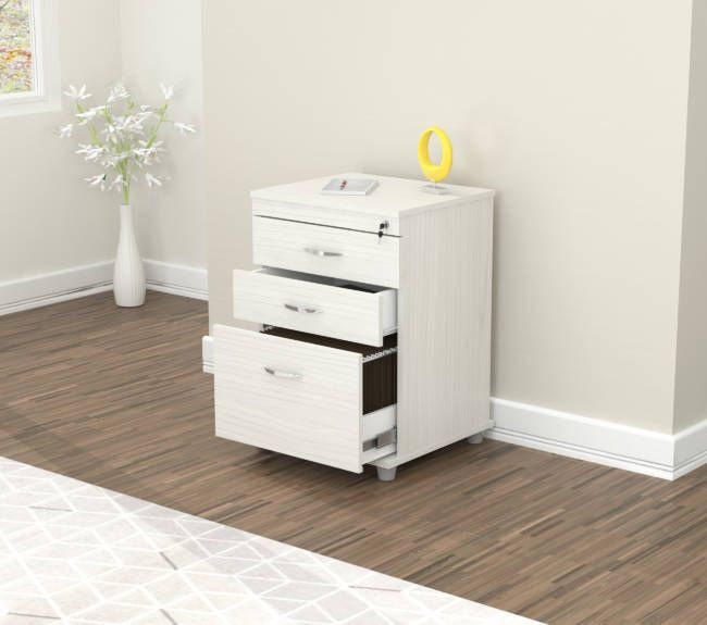 File cabinet the front edge of file and drawer front panel have soft-form edges. Finished on all sides. 2 accessory drawers, 1 file drawer accommodates letter or legal files with full extension slides. All 3 drawers lock for added security. Chrome metal handles. Plastic base gliders.