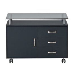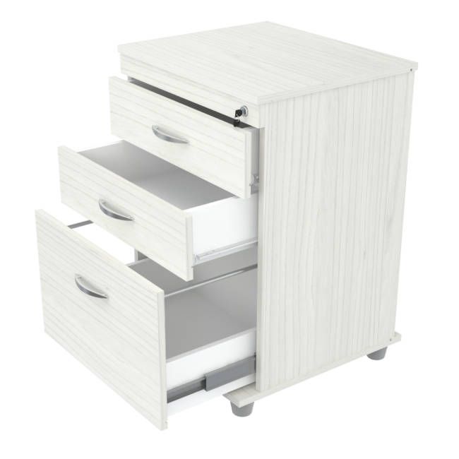 File cabinet the front edge of file and drawer front panel have soft-form edges. Finished on all sides. 2 accessory drawers, 1 file drawer accommodates letter or legal files with full extension slides. All 3 drawers lock for added security. Chrome metal handles. Plastic base gliders.