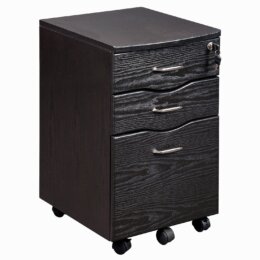 3 drawer file cabinet with front edge of file and drawer front panel have soft-form edges. Finished on all sides Three file drawer with full extension slides accommodate letter or legal files. All 3 drawers lock for added security. Chrome metal handles. Plastic base gliders. Laminated in double-faced durable melamine which is stained, heat and scratch resistant. Finished in Espresso-Wengue. Solid engineered wood.