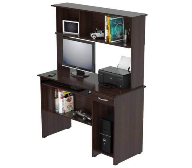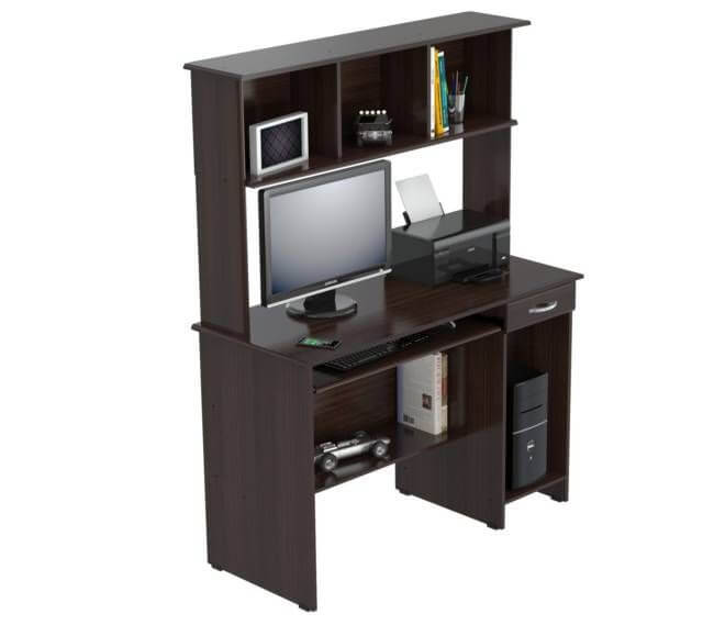 Slide-out keyboard tray. Designed to hold computer keyboard and mouse. Hutch provides ample space for storage. Dedicated area for CPU tower. One (1) box drawer with metal handle. Laminated in double-faced durable melamine which is stained, heat and scratch resistant, finished in Espresso-Wengue, solid engineered wood.