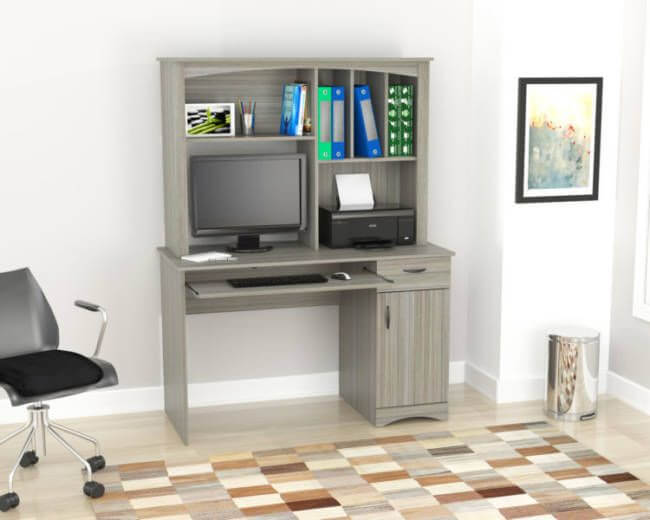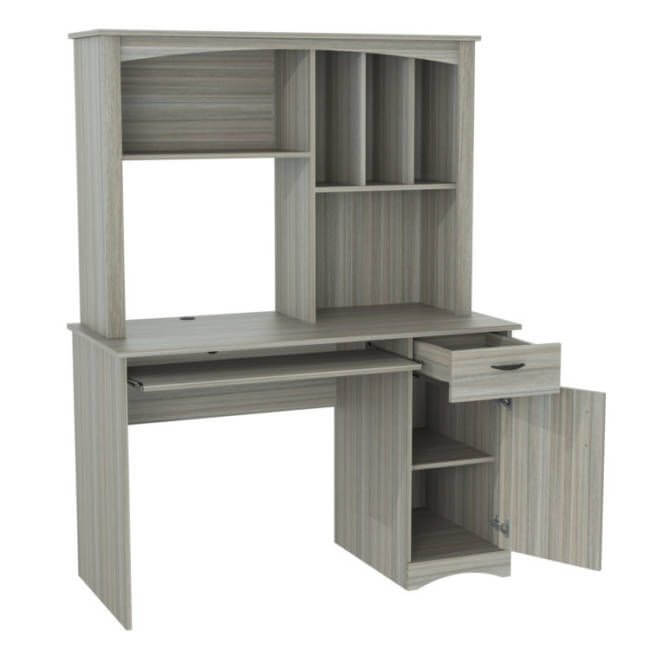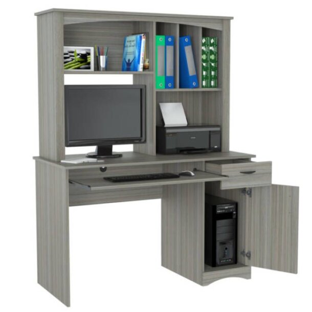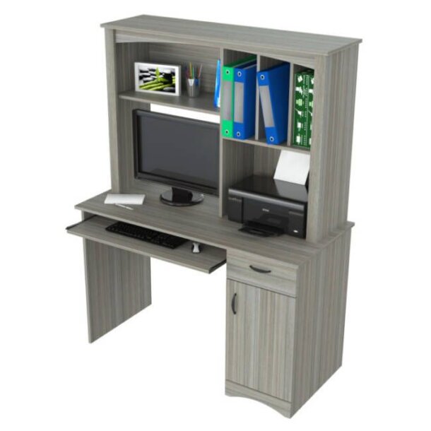 Bandya Workstation w/Hutch collection by Inval® finished in a rich “Smoke Oak” laminates in durable melamine which is stain, heat and scratch resistant. Constructed from manufactured wood. The workstation features a sleek and contemporary design which provides just the right amount of space for your monitor and work space. It offers a pull-out keyboard/mouse tray to help save space. The desk is equipped with a drawer to store your office supplies and a storage area concealed by a door for your CPU. The cable management pass-through feature keeps all cords organized. Both the laminates and design make it ideal for staging and decorating your home office or office.