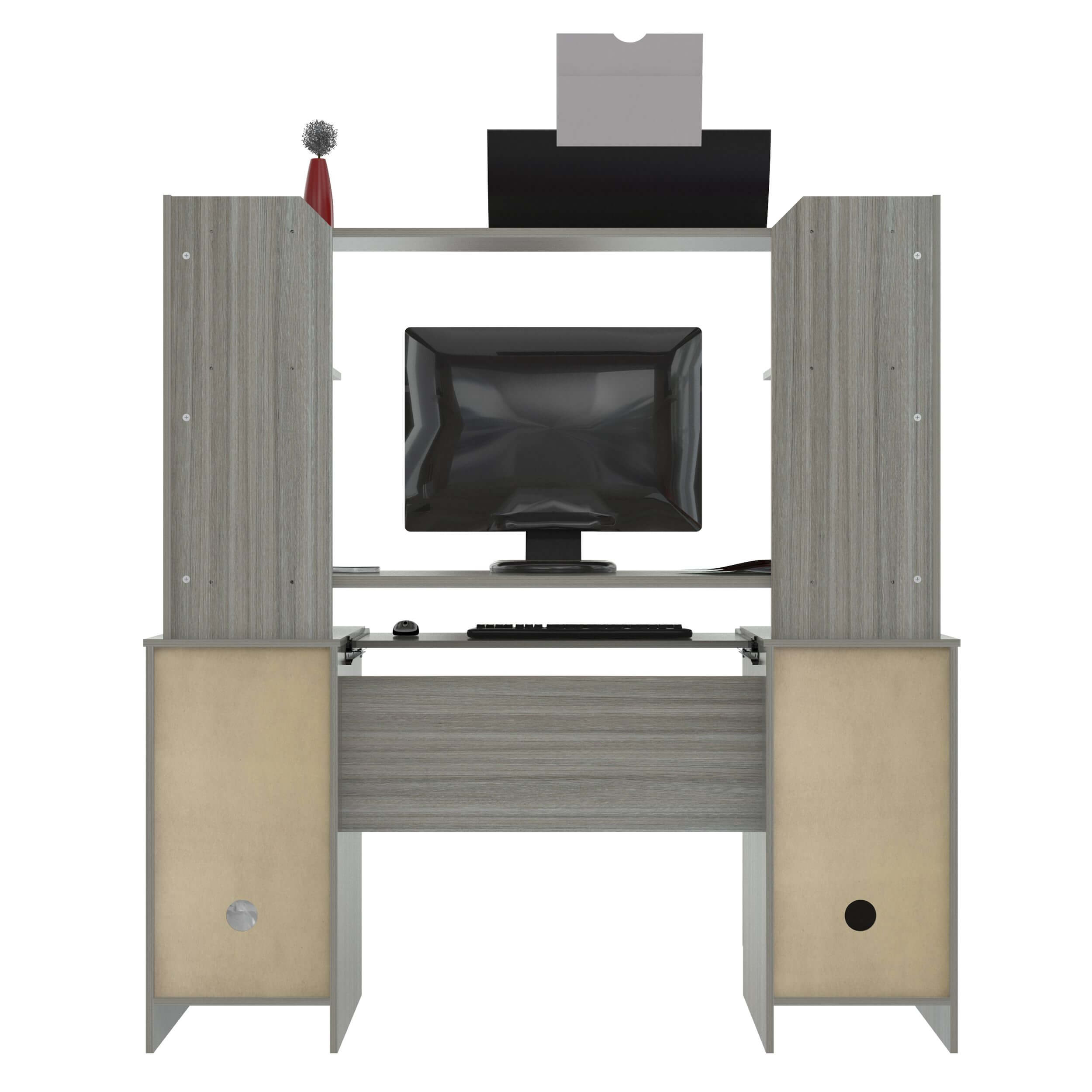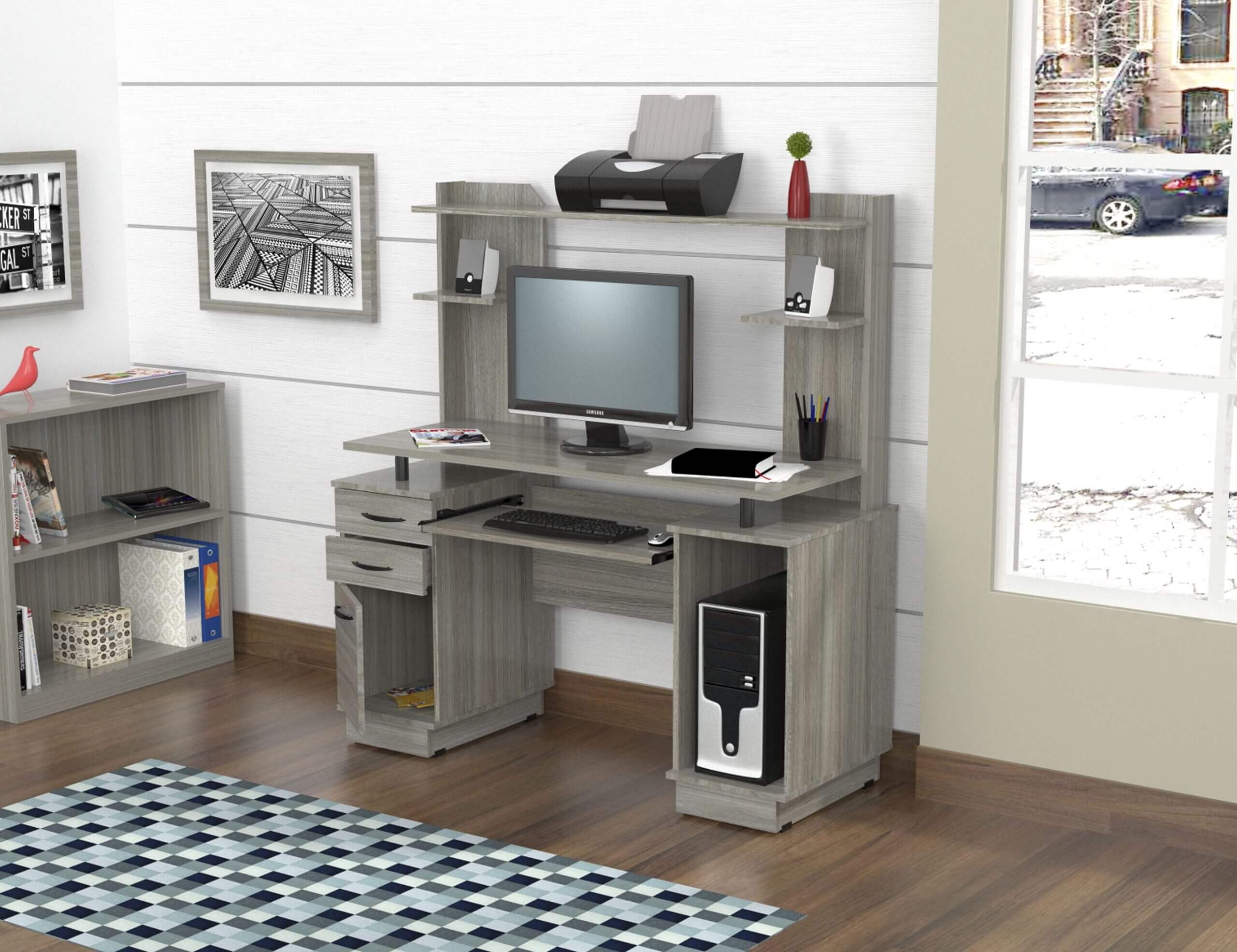 Computer Work center w/Hutch by Inval® finished in a rich “Smoke Oak” laminates in durable melamine which is stain, heat and scratch resistant. Constructed from manufactured wood. This unit offers an ample work surface making perfect for any home office or office. One pedestal has two accessory drawers with metal slides and a concealed storage compartment. The other pedestal is an open compartment for storage or a CPU. It includes a pull-out keyboard shelf with metal drawer glides, brushed metal handles and risers. The hutch features three shelves to accommodate accessories. Both pedestals have plastic base gliders to protect the unit when moving it.