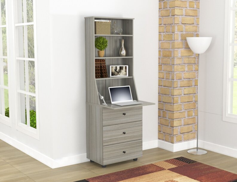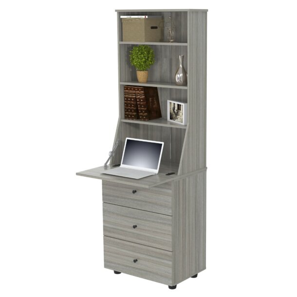 Computer/Credenza Work center by Inval® finished in a rich “Smoke Oak” laminates in durable melamine which is stain, heat and scratch resistant. Constructed from manufactured wood. This unit offers an ample hidden work surface which folds up to change the unit’s look from an office space to a home credenza and blends traditional with classis style. The unit features hidden storage behind the drop down desktop, three (3) large box drawers with metal drawer glides that can accommodate your office supplies and other home storage items. The attached hutch has three (3) shelves and allows you to display books, binders and other decorations to match your home décor. Our unit is equipped with anti-tilt hardware.