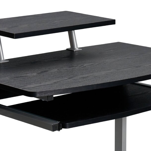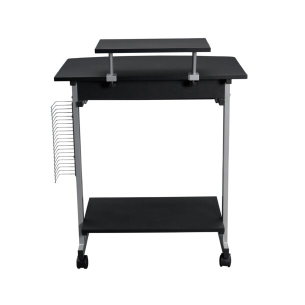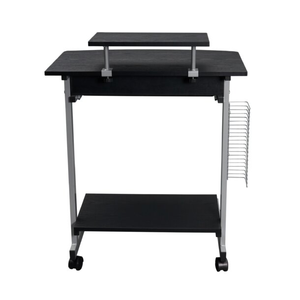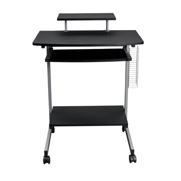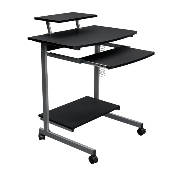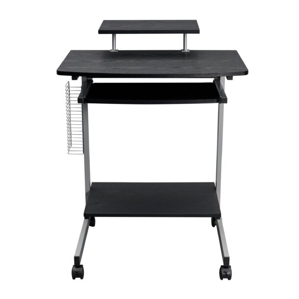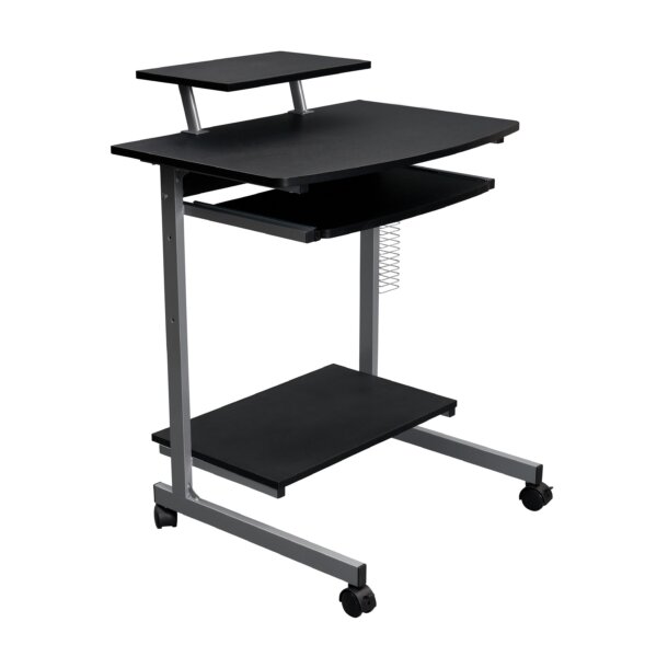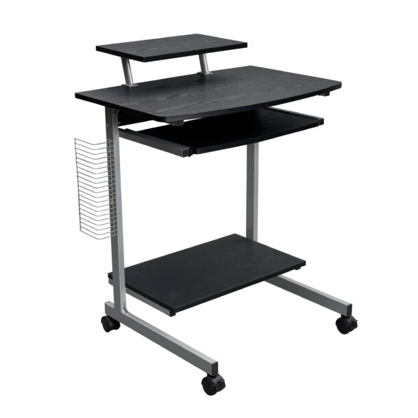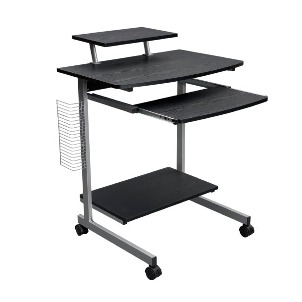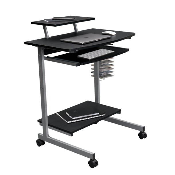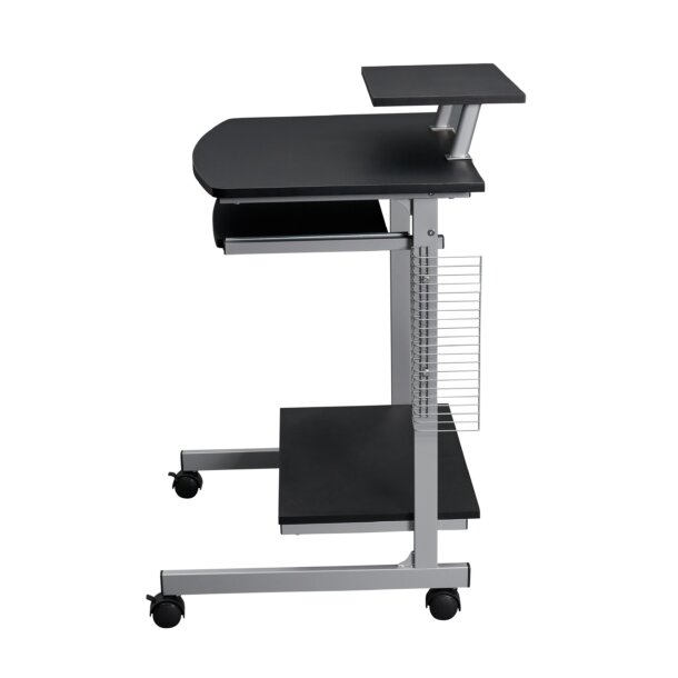This Compact Computer Cart is made with heavy-duty engineered wood panels with a moisture-resistant PVC laminate veneer and a scratch-resistant powder-coated steel frame. The adjustable shelf can be mounted center, right, or left of the desktop. It also features a slide-out keyboard shelf equipped with a safety stop, side media rack for CDs or DVDs, a bottom accessory shelf, a large bottom shelf to accommodate a CPU and accessories, and large double-wheel non-marking locking casters. The desktop has a 100lb weight capacity, the shelves each have a 30lb weight capacity, and the keyboard shelf can hold up to 20lbs. Color: Graphite & Espresso.