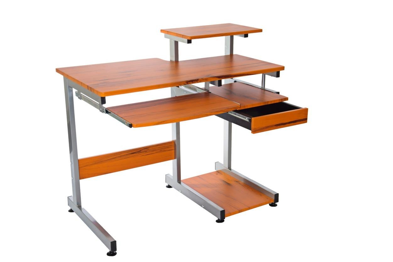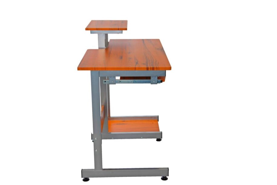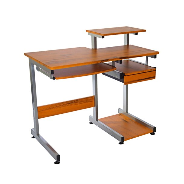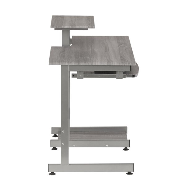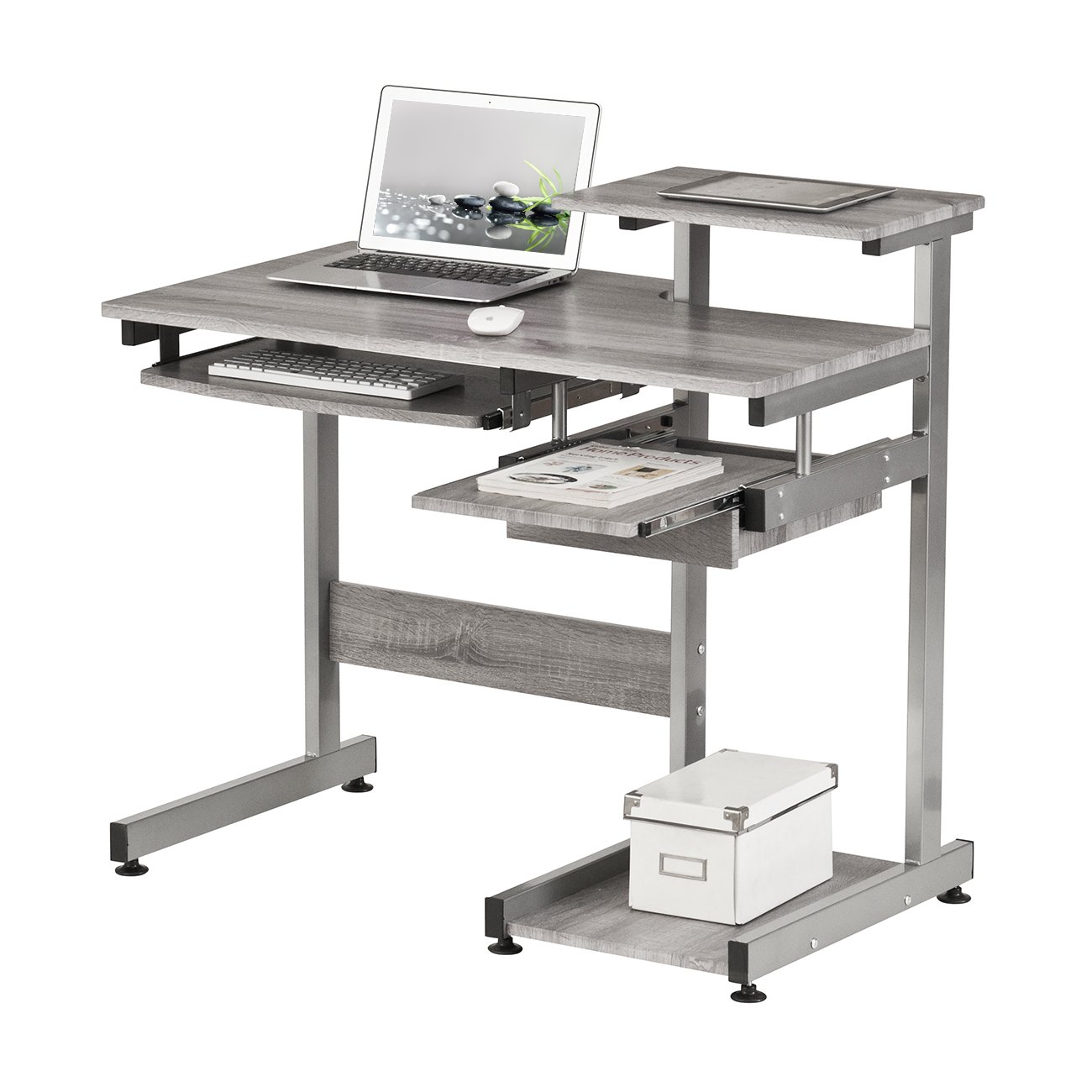 This Complete, Space Saving Computer Workstation it lends an air of traditional workmanship to its a versatile contemporary design. It has a simple yet sturdy design made of heavy-duty engineered wood panels with a moisture-resistant PVC laminate veneer and a scratch-resistant powder-coated steel frame. The keyboard shelf, adjacent shelf, and utility drawer are all mounted on slide out tracks featuring safety stops and have a 30 lb weight capacity. The spacious desktop can hold up to 80 lbs. Color: Grey & Wood Grain.