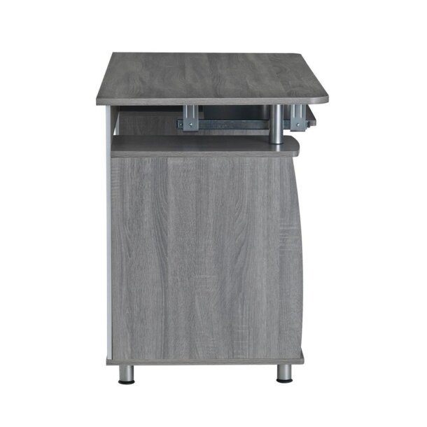 This Desk is a complete workstation offering an ample work surface and plenty of storage space. It features an accessory shelf atop a storage cabinet, a keyboard panel equipped with a safety stop, 2 drawers, and a file cabinet. The CPU/Storage cabinet not only has a removable shelf that can be placed up, down, or completely removed but also has a large back opening for cables. The desktop has an 80 lbs weight capacity, while the shelves can each hold up to 30 lbs, and the drawers each have a 22 lbs weight capacity. This elegant desk is made of heavy-duty MDF panels with a moisture-resistant PVC laminate veneer atop scratch-resistant powder-coated steel supports. Color: Grey & Chocolate.