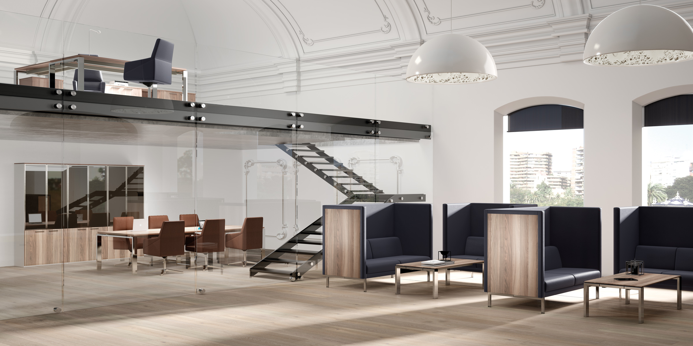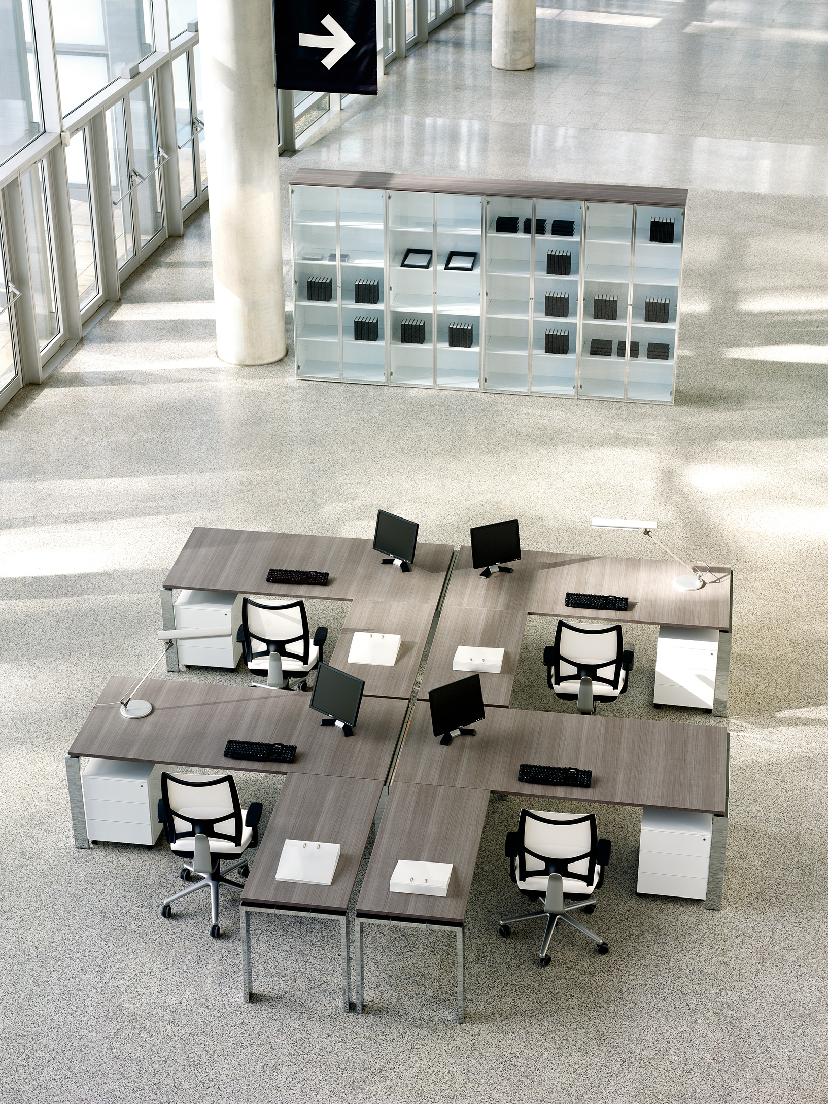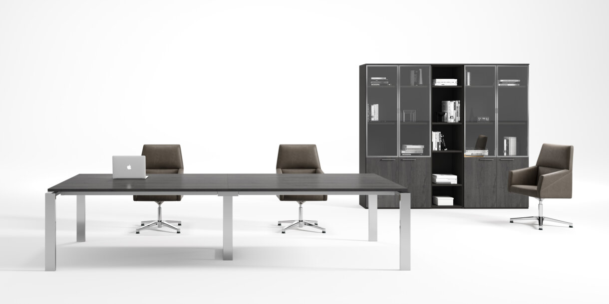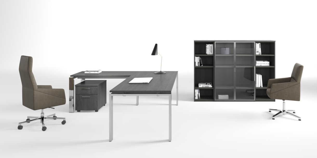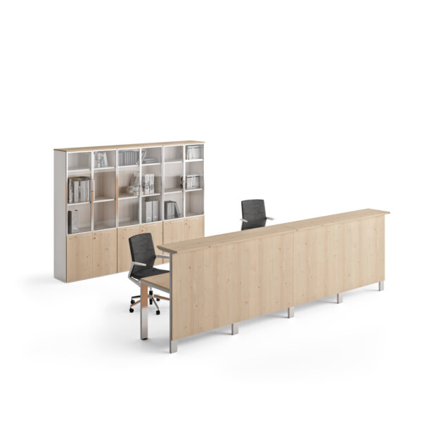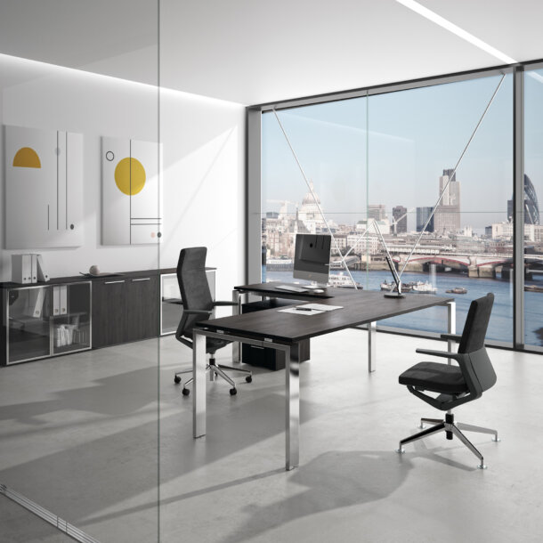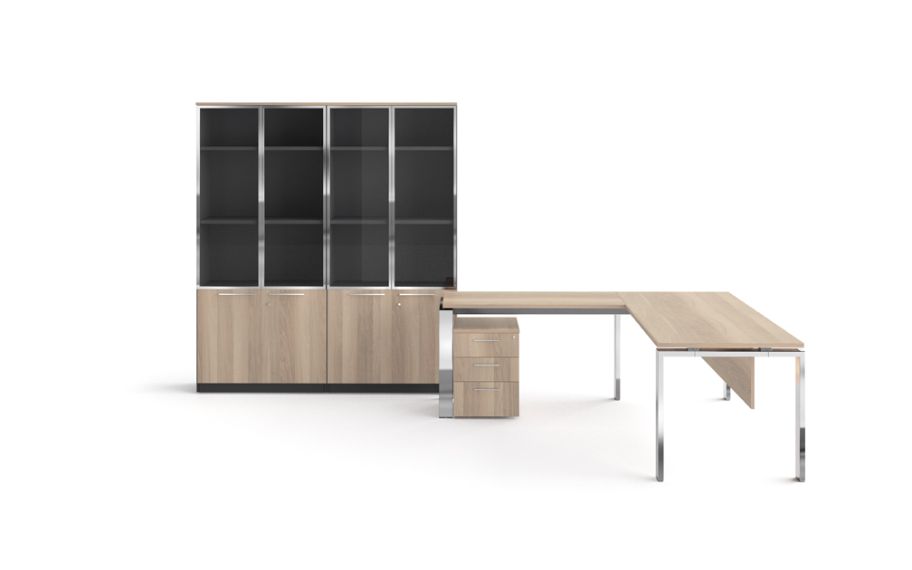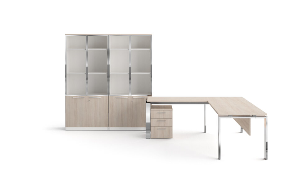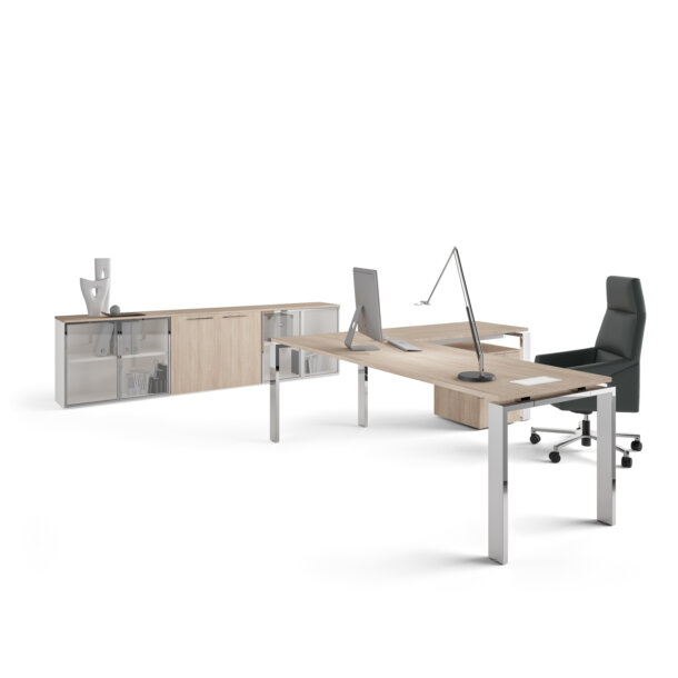 A chrome structure with melamine and glass boards and metallic cabinets and storage units are the materials that are used to create this collection of executive furniture, which can also be offered as managerial furniture.