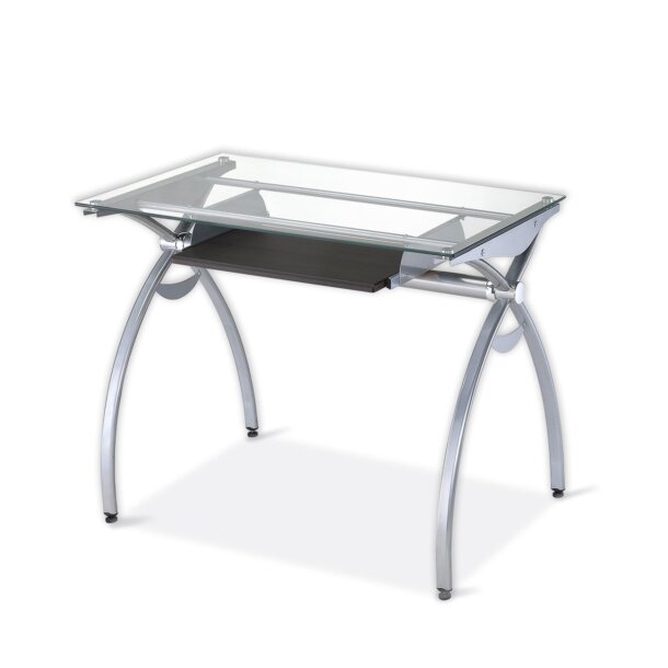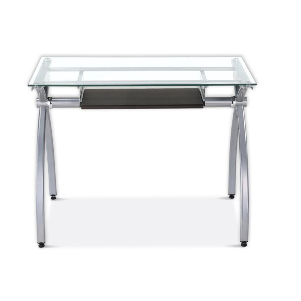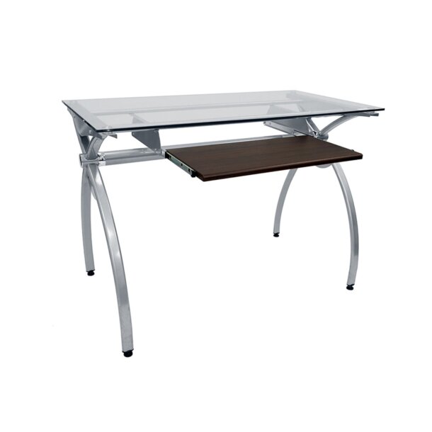The contempo style of this Glass-Top Computer Desk brings a crisp and smart ambiance to any office. It features a heavy-duty 8 mm tempered safety glass desktop, the stylish lines of a curved scratch-resistant powder-coated steel frame, and a pull-out keyboard panel with moisture resistant PVC laminate veneer in a Mahogany finish. With its compact footprint you can furnish your workspace with style and efficiency. The desktop has a 110 lb. weight capacity and the keyboard shelf has a 33LBS weight capacity. It is ready and easy to assemble. Color: Clear Glass & Mahogany Keyboard.