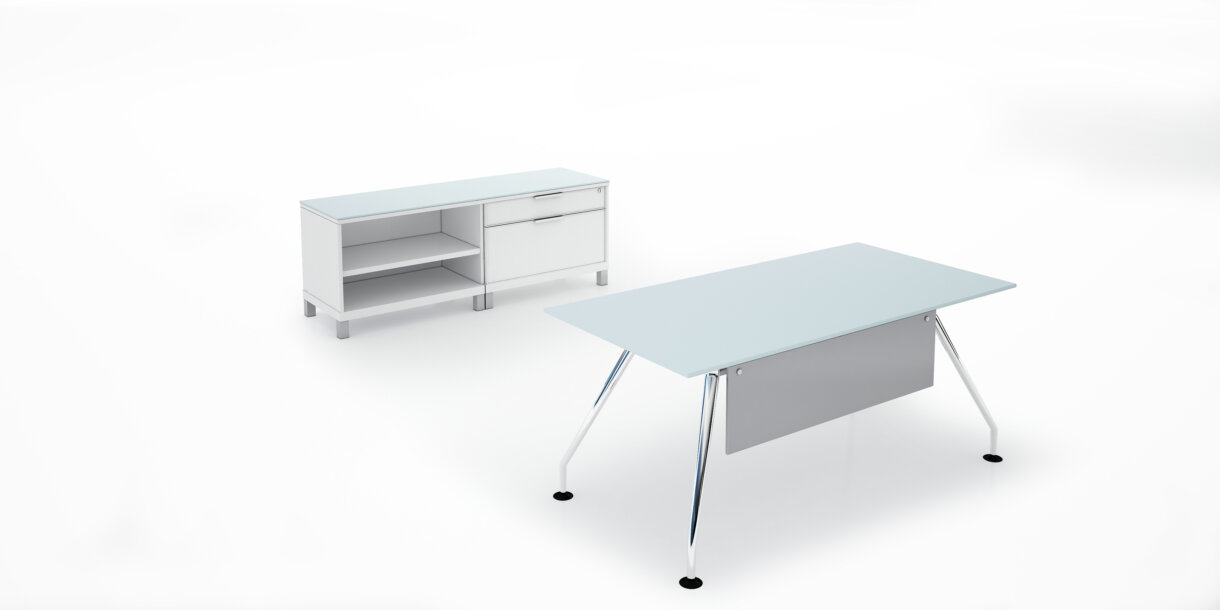 Duca Collection is a collection with that features a strong all chrome design for the minimalist office. Work-surface tops are available in both wood and glass.