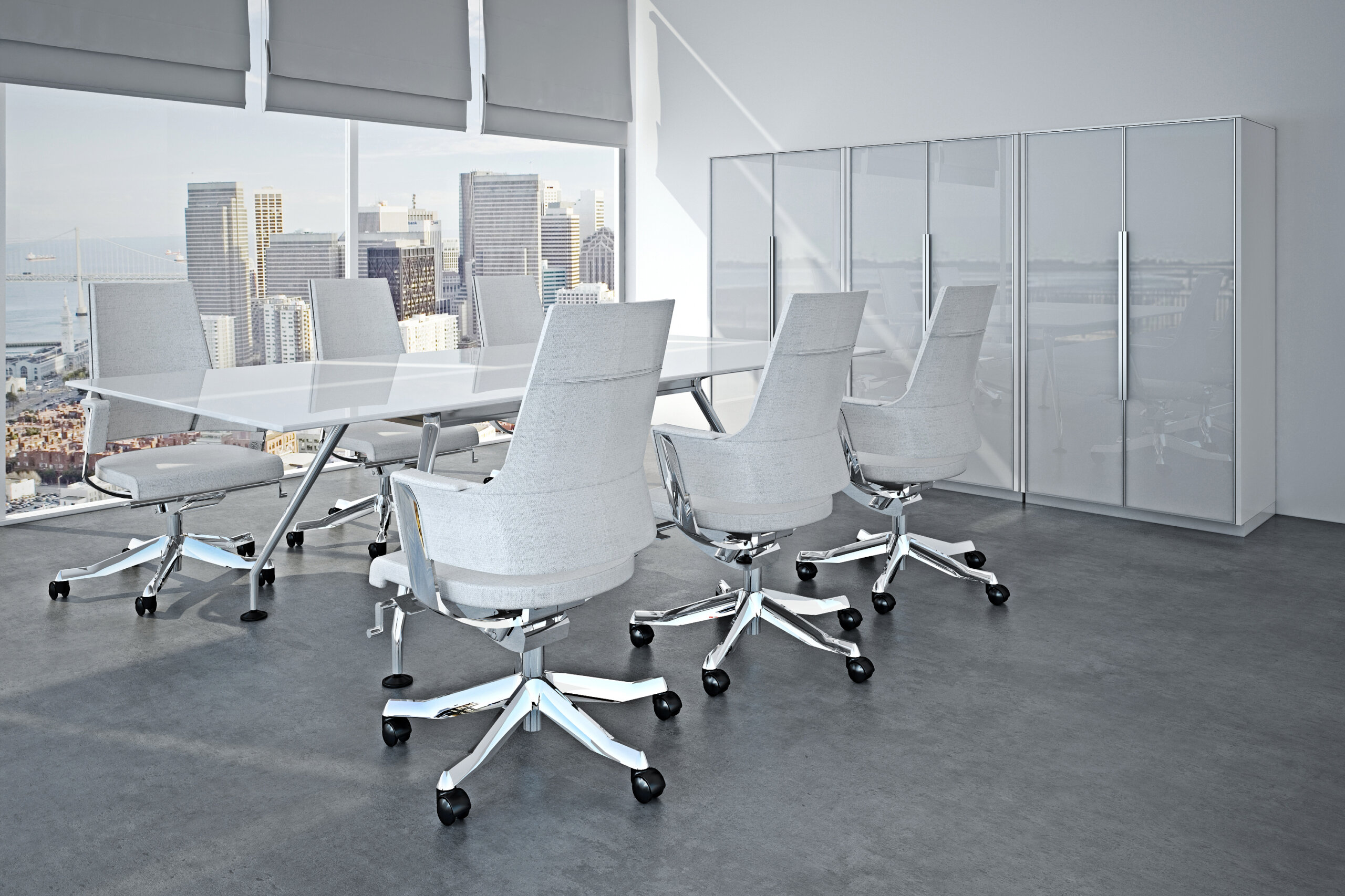 Duca Collection is a collection with that features a strong all chrome design for the minimalist office. Work-surface tops are available in both wood and glass.