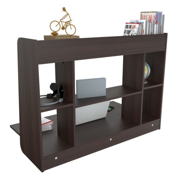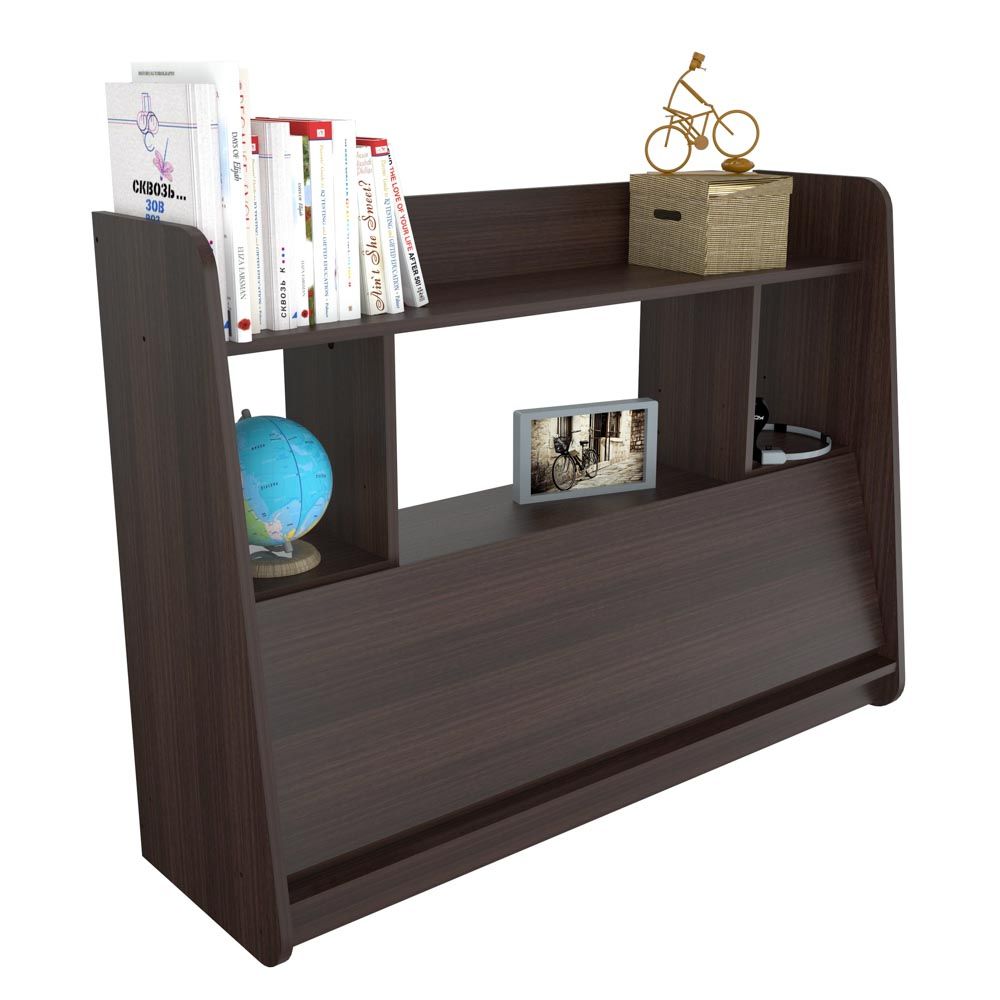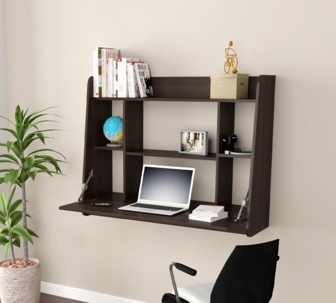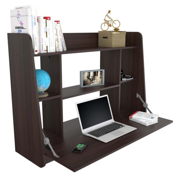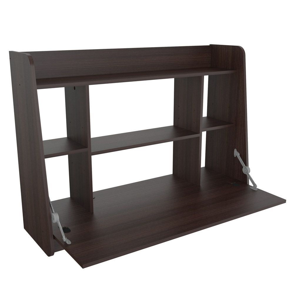 Wall Mounted Floating Desk finished in a rich “Espresso” laminates in durable melamine which is stain, heat and scratch resistant and is constructed from manufactured wood. This fashionable desk is the ideal remedy for your home or office compact desk needs. It features a fold down desktop with plenty of room for your laptop and other desk accessories. Six various size shelves which deliver lots of storage space for books, files, picture frames, and other décor accessories. At the end of the day the desktop folds into the wall mounted floating unit converting it into a wall unit for displaying your decoration. Chair, laptop and decorative accessories are sold separately and not available through Inval. Assembly and installation required.