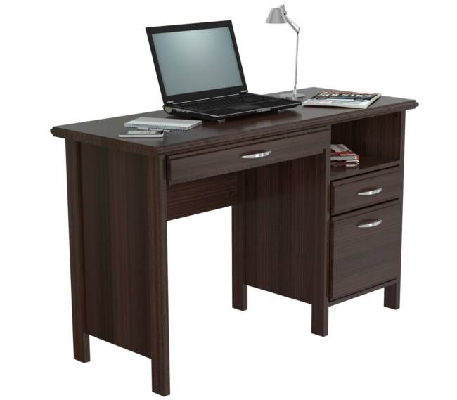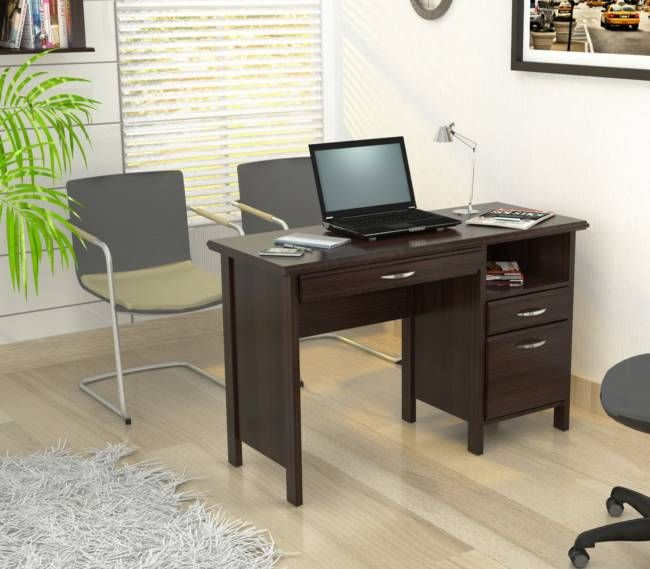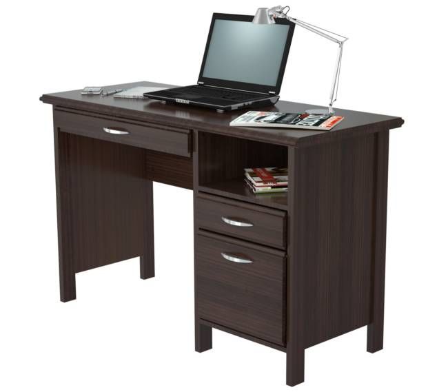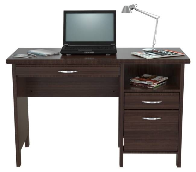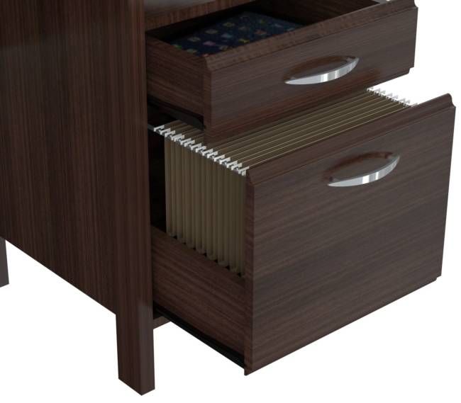 Soft form computer desk. Features a 1″ thick soft form top with a laminated modesty panel. It comes with a slide-out keyboard shelf along with 1 open storage shelf. 1 accessory drawer. 1 file drawer for extra storage. Laminated in double-faced durable melamine which is stained, heat and scratch resistant, finished in Espresso-Wengue, solid engineered wood. Can be used as a stand alone desk or with Wall-Mounted RE 0732, which is sold separately.