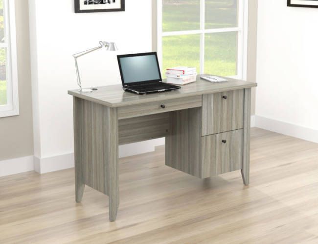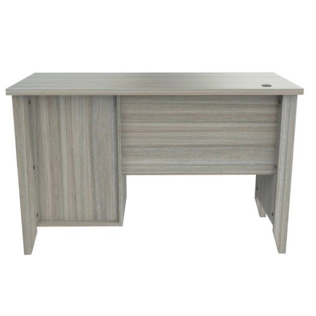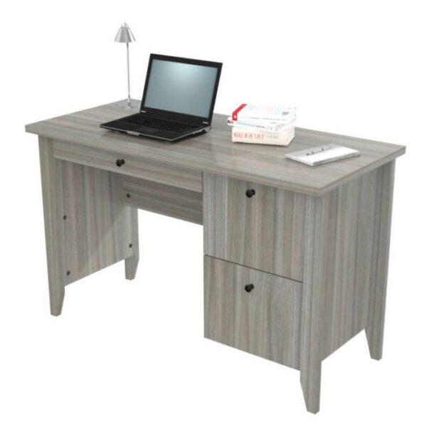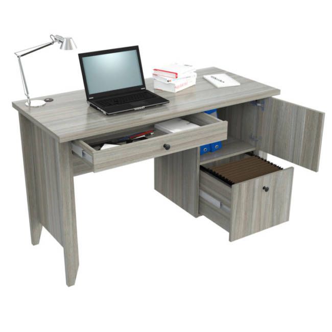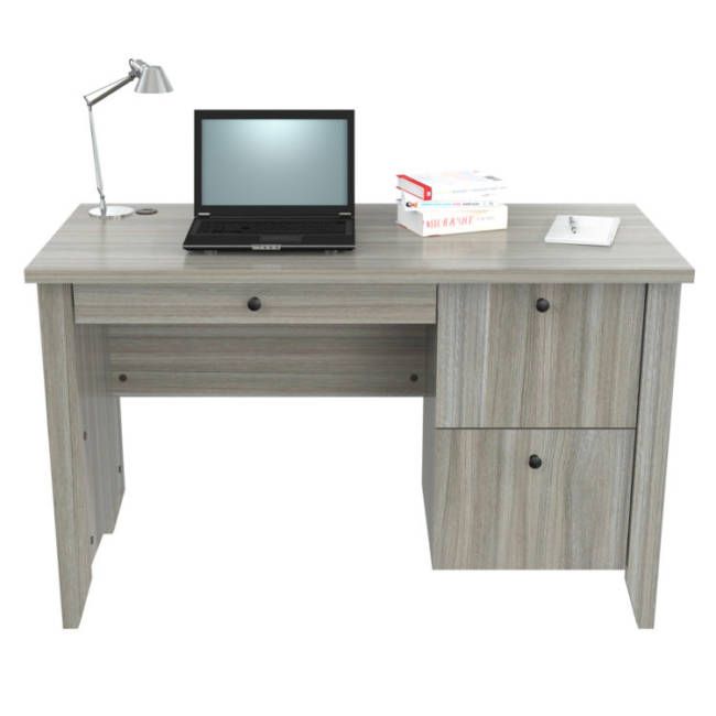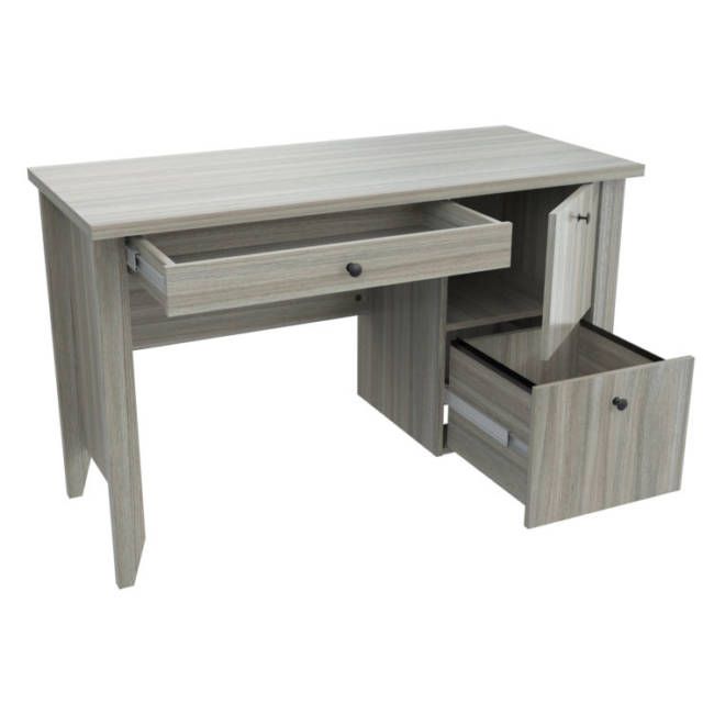 This computer table has a simple yet steady construction that adds to its dependability. The contemporary style of the table blends in with most room decors. This computer desk is constructed from manufactured wood in “Smoke Oak” melamine laminate which is stain, heat and scratch resistant and a 2mm commercial grade edge banding. The desk features a 47” (120cm) work surface ideal for your laptop, tablets and your daily paper work. It also includes a bottom drawer with full metal extension slides that can accommodate letter sized hanging files, a top storage area with a door mounted with concealed euro hinges and a center pencil drawer to house your pens, notepads and other office essentials. The desk has a double laminated modesty panel with cable management pass-through.