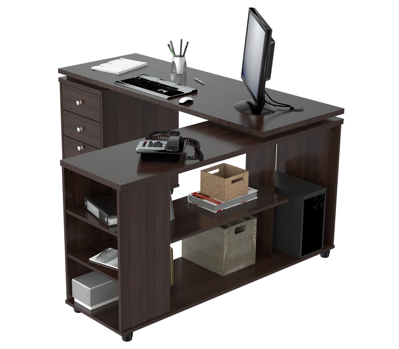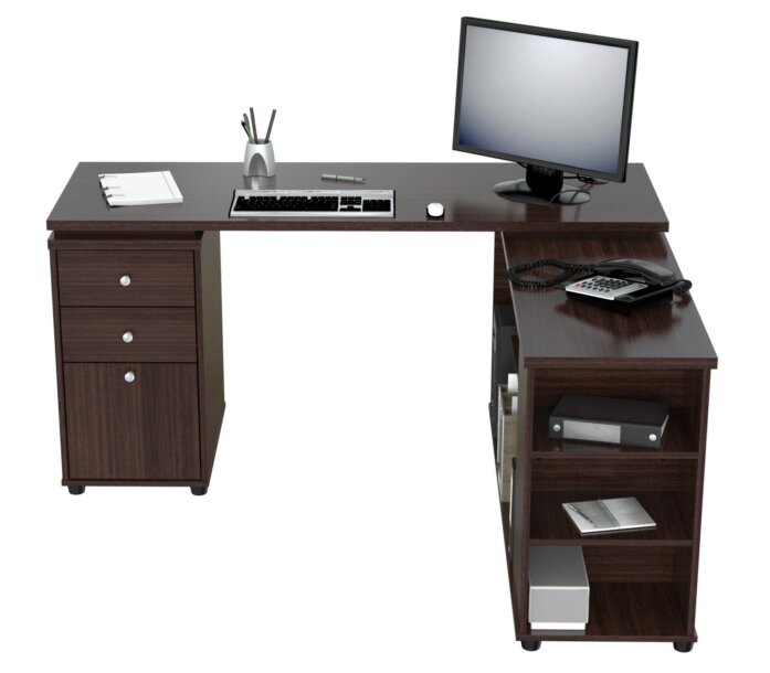 One (1) file drawer which accomodates letter or legal size files. Two (2) accessory drawers with metal slides and chrome metal handles. It offers an ample work space, shelves for books, dedicated CPU storage, printer space, and other accessories. Left and Right assembly. Laminated in double-faced durable melamine which is stained, heat and scratch resistant. One (1) inch top with 2mm edge banding. Solid engineered wood. Packed in Two (2) Cartons.