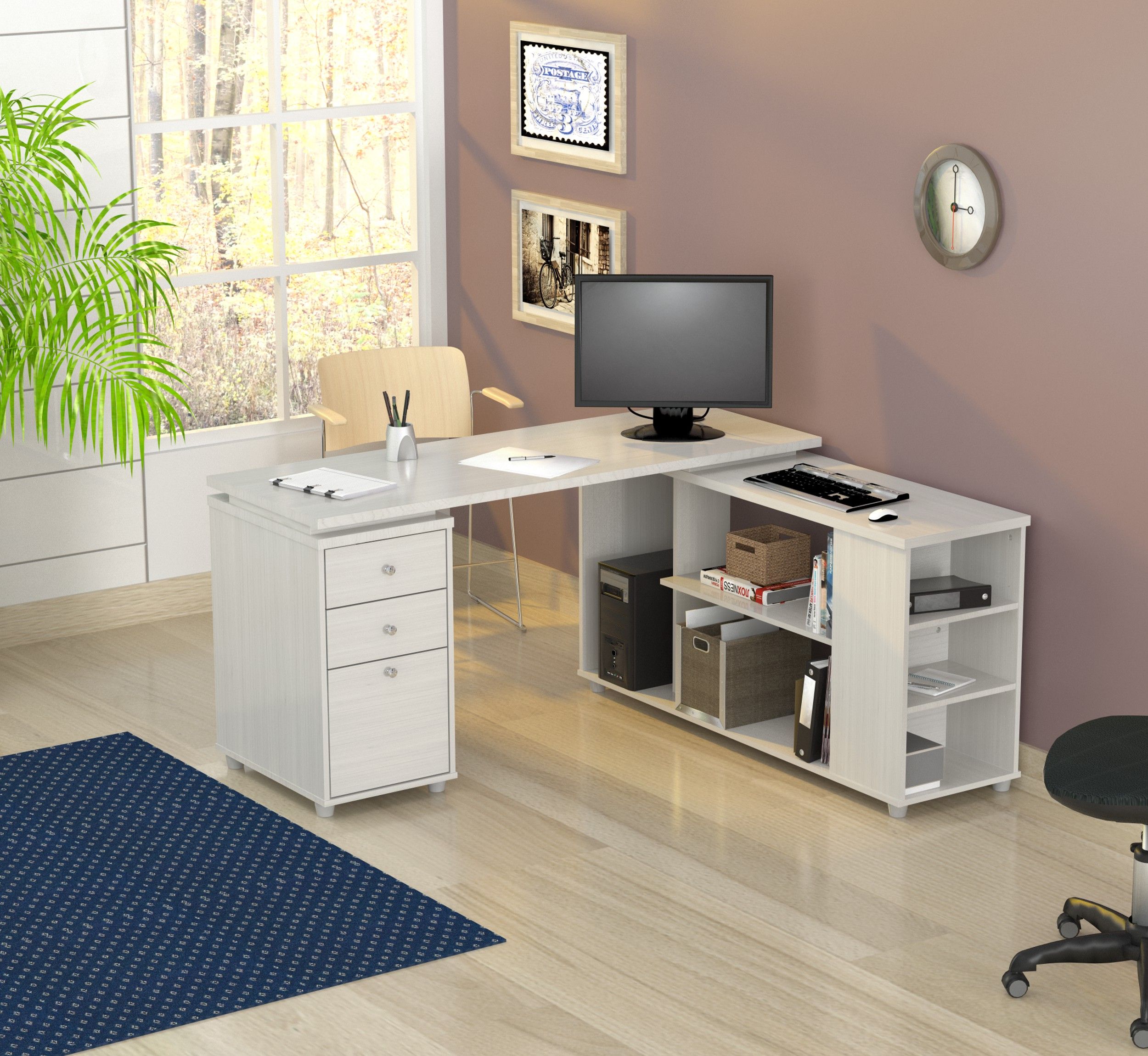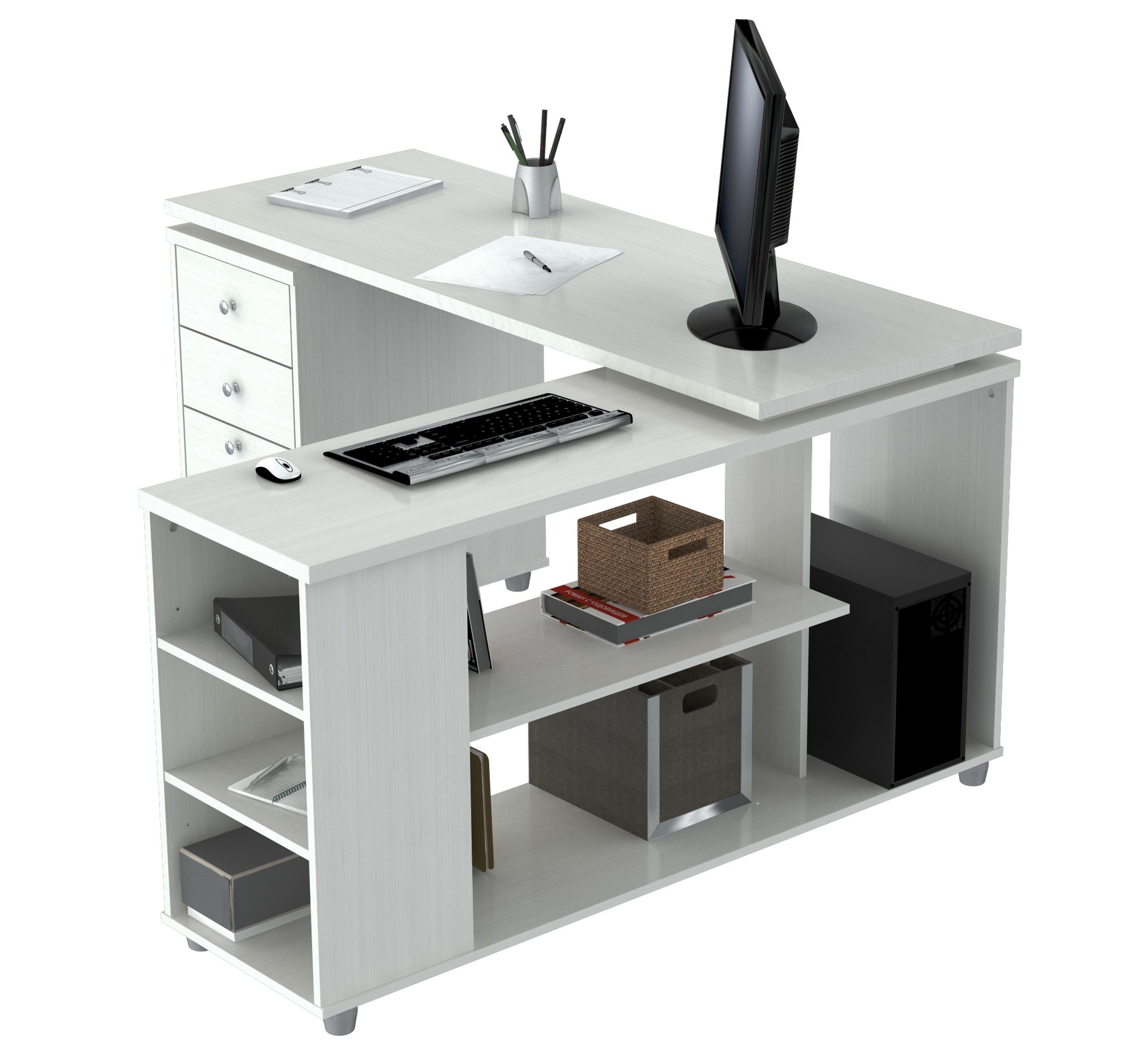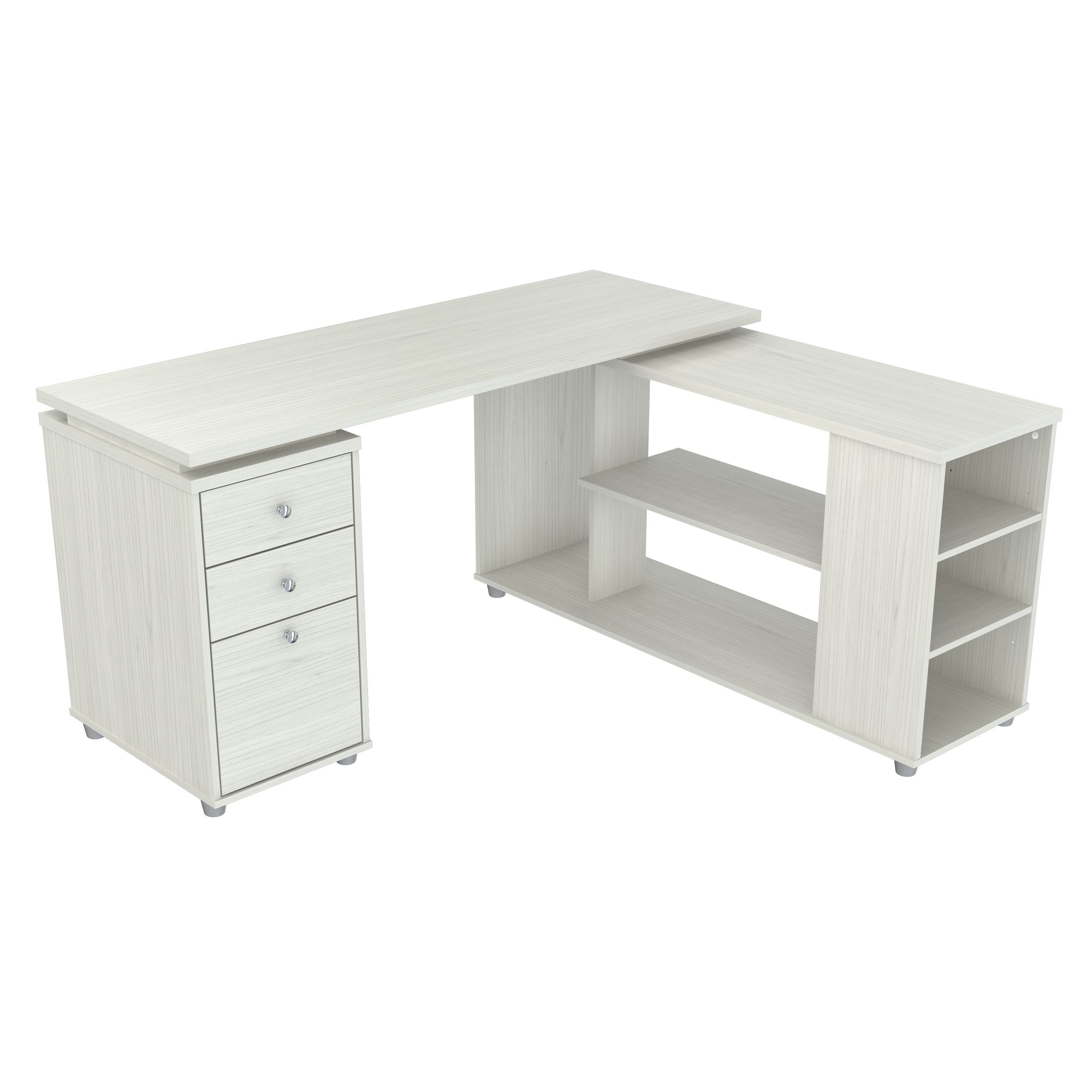 L-Desk with shelves features 1 file drawer which accomodates letter or legal size files and 2 accessory drawers with metal slides and chrome metal handles. It offers an ample work space, shelves for books, dedicated CPU storage, printer space, and other accessories. Can be assembled in a left or right configuration. Laminated in double-faced durable melamine which is stained, heat and scratch resistant, 1 inch top with 2mm edge banding. Finished in Larcinia-White, solid engineered wood. Packed in Two (2) Cartons.