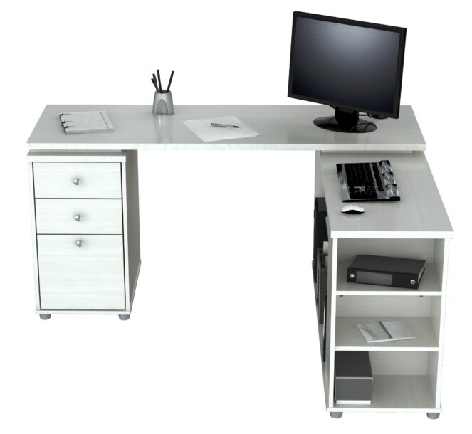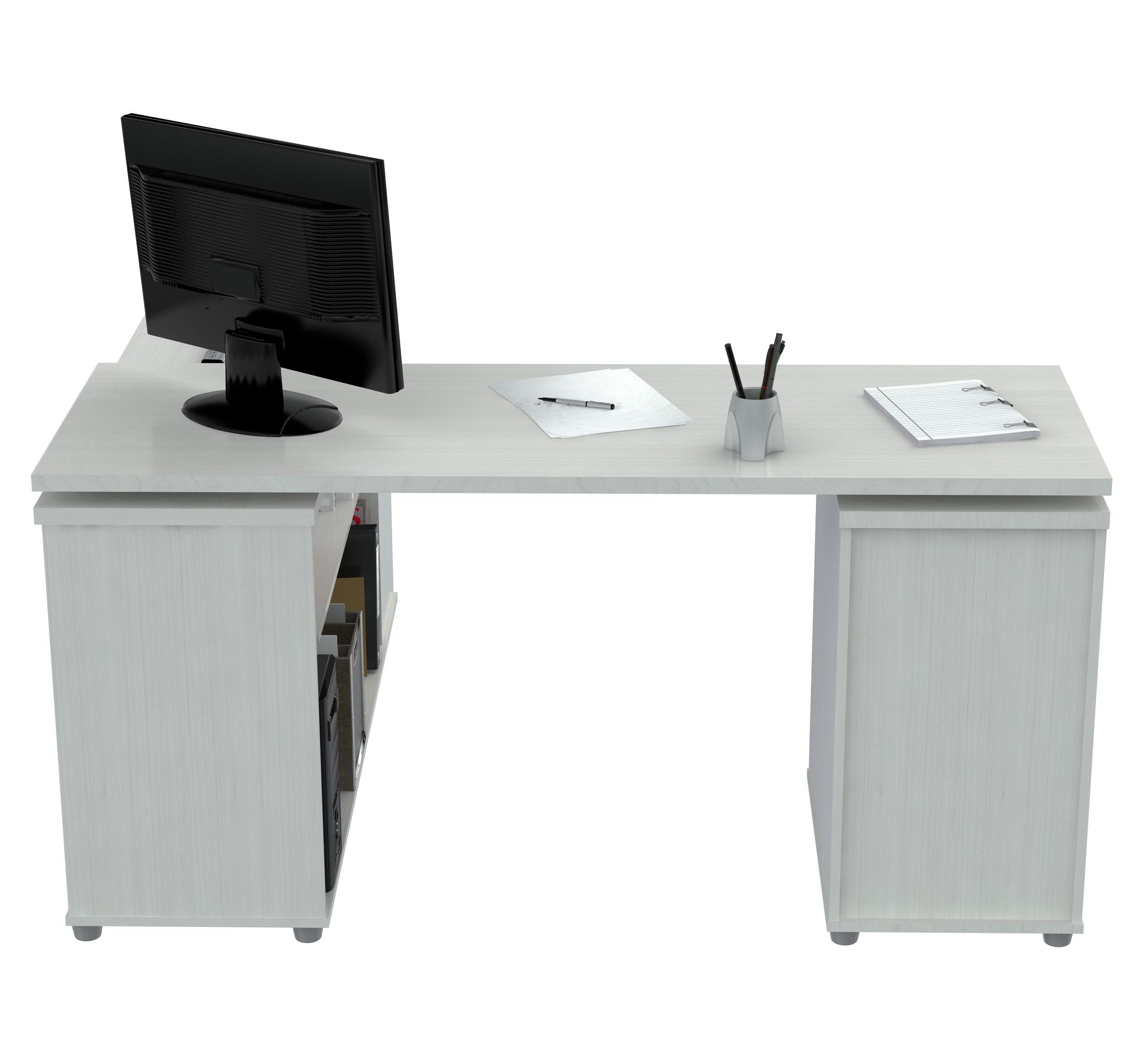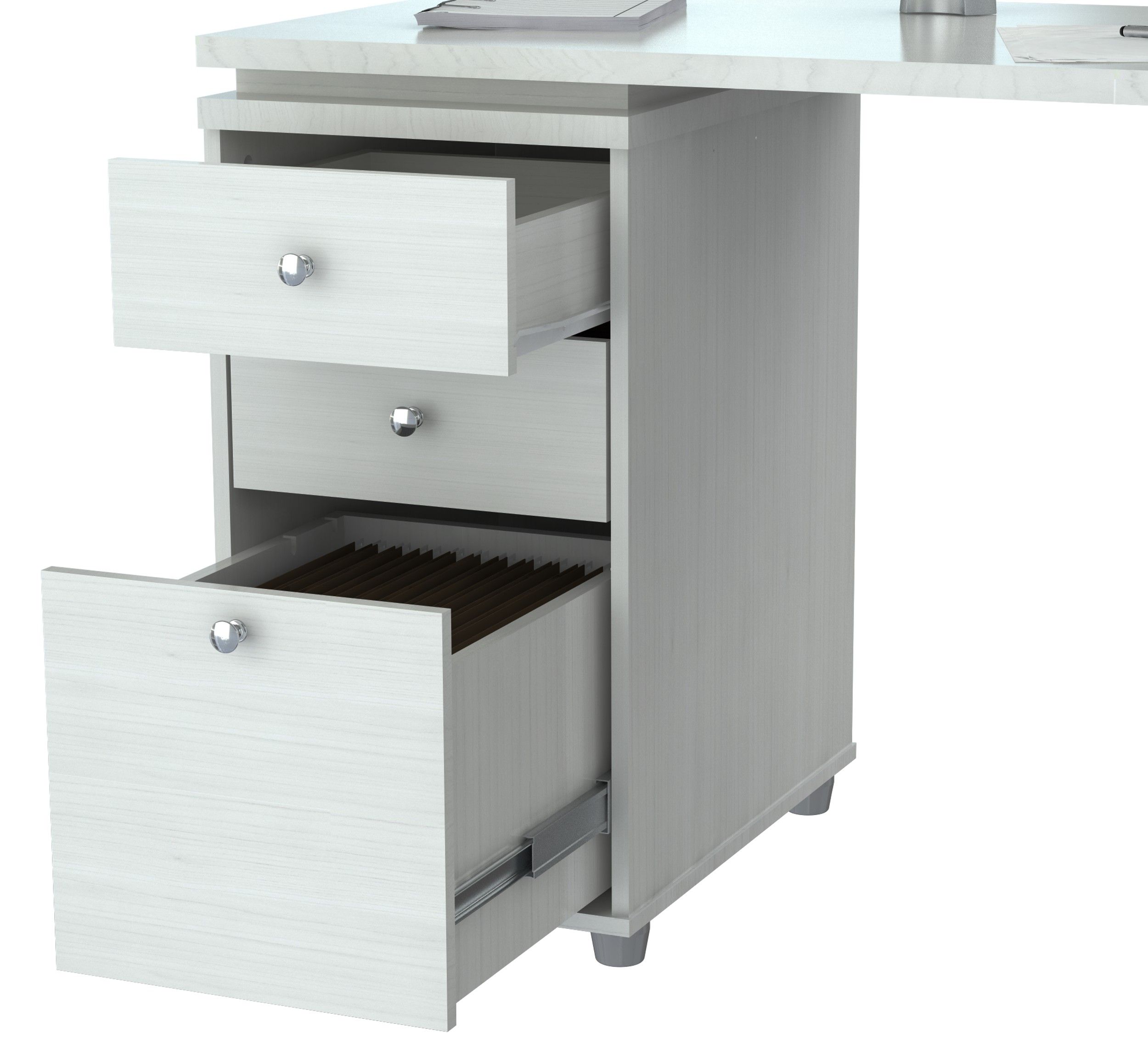 L-Desk with shelves features 1 file drawer which accomodates letter or legal size files and 2 accessory drawers with metal slides and chrome metal handles. It offers an ample work space, shelves for books, dedicated CPU storage, printer space, and other accessories. Can be assembled in a left or right configuration. Laminated in double-faced durable melamine which is stained, heat and scratch resistant, 1 inch top with 2mm edge banding. Finished in Larcinia-White, solid engineered wood. Packed in Two (2) Cartons.