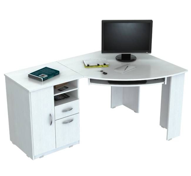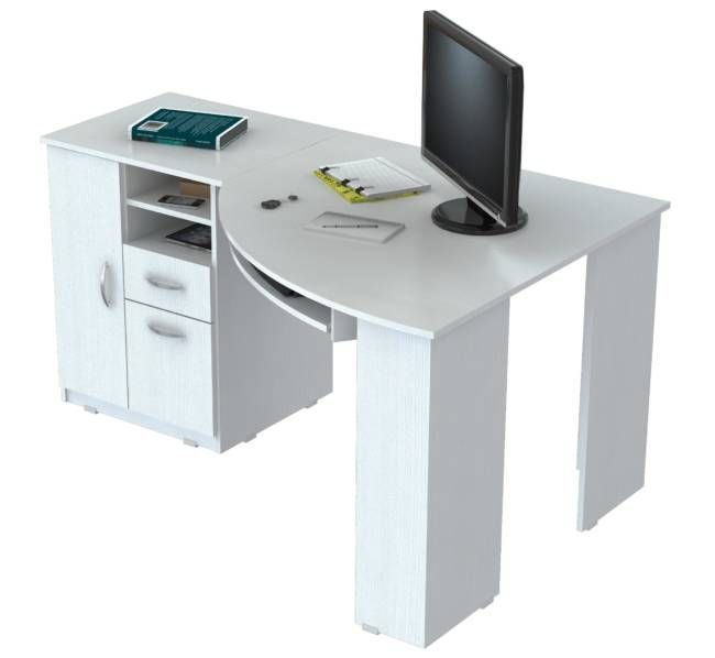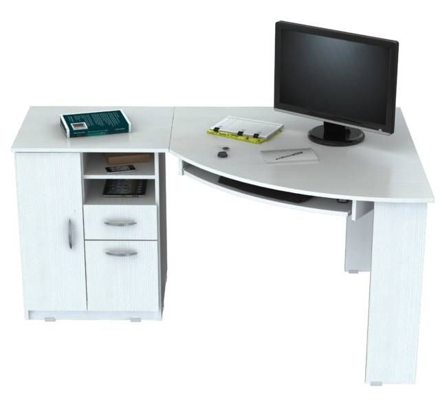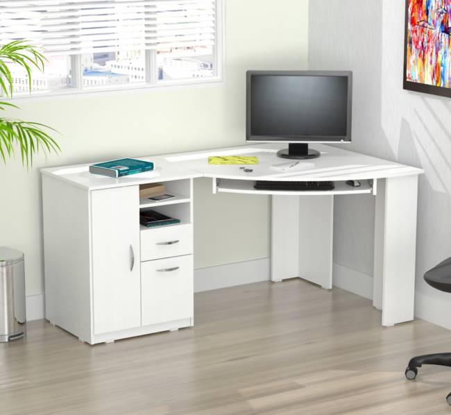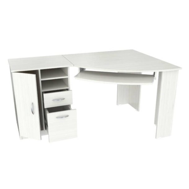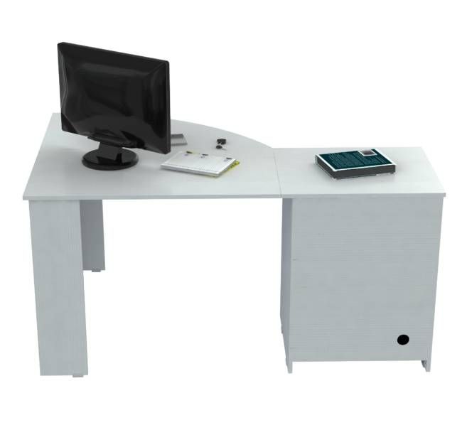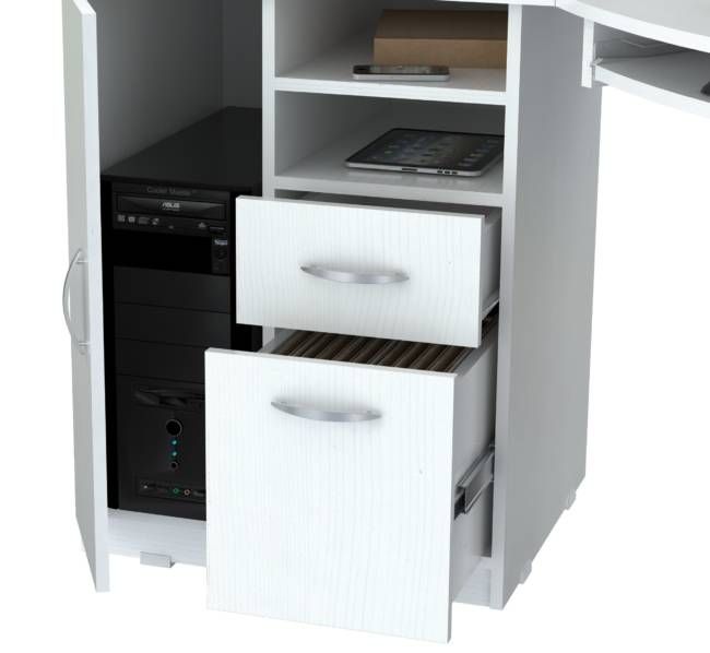 “Inval” Corner computer desk or stand alone. Open storage compartment. One accessory drawer with chrome metal handle and metal slides, one file drawer with chrome metal handle and full extension slides. Accommodates letter and legal size file hangers. Ample CPU storage compartment, door with chrome metal handle, plastic base gliders. Laminated on all sides in Larcinia-White with double faced durable melamine wood which is stain, heat and scratch resistant. Made out of Solid composite wood.