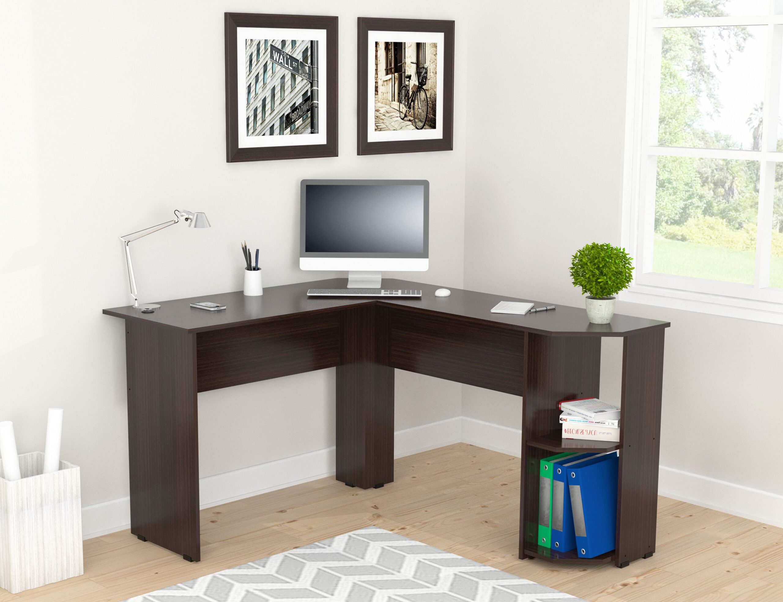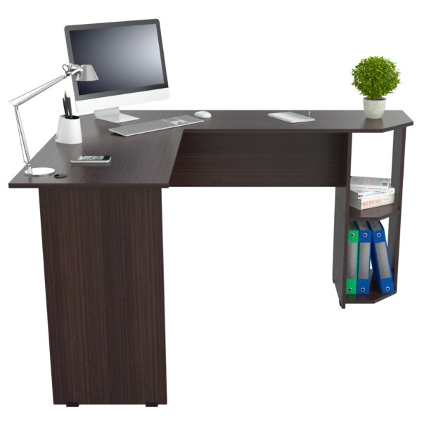 MERLIN” L-Shaped writing desk is constructed from manufactured wood and finished in “Espresso-Wengue” double laminated durable melamine which is stain, heat and scratch resistant. With large dual desktops, you have an abundance of room on which to place your laptop, tablet, documents, office supplies and any other décor to add a personal touch. The desk is equipped with a cable management pass-through to keep all cords organized. The design without center obstacles makes it simple to move from side to side enabling you to work in an effortlessly manner. Both the laminates and design make it ideal for staging and decorating your home office or office.