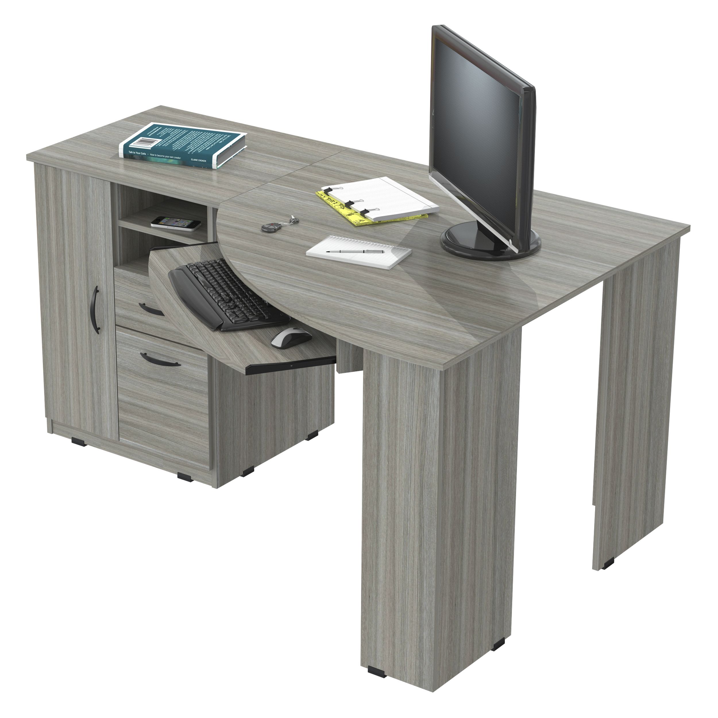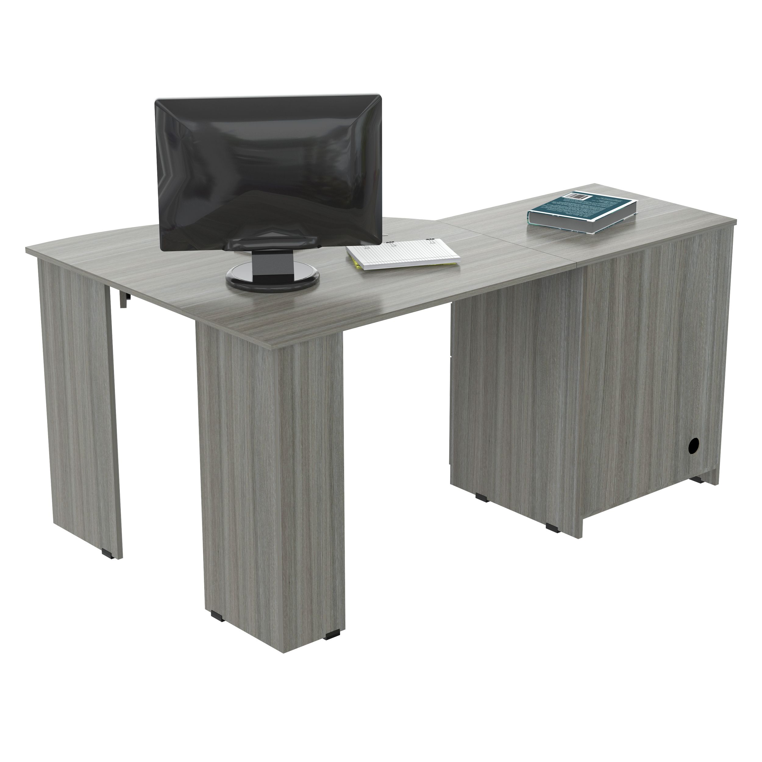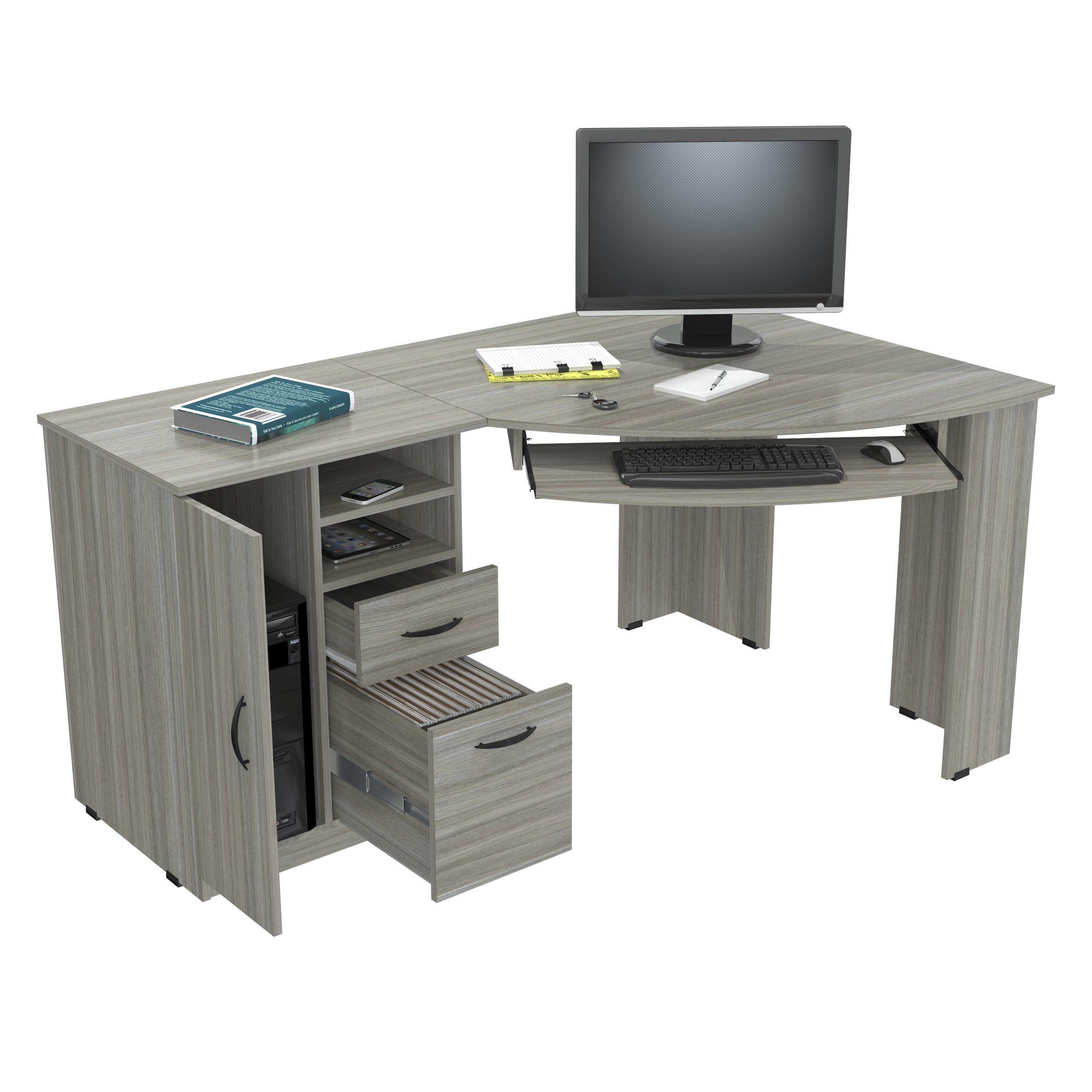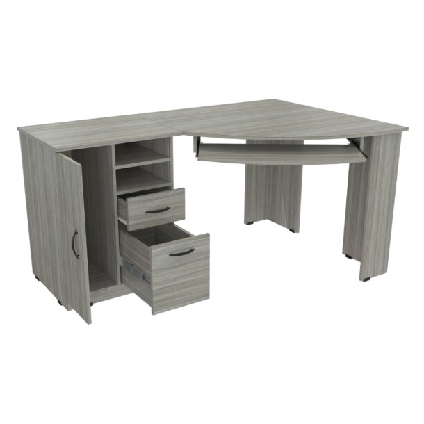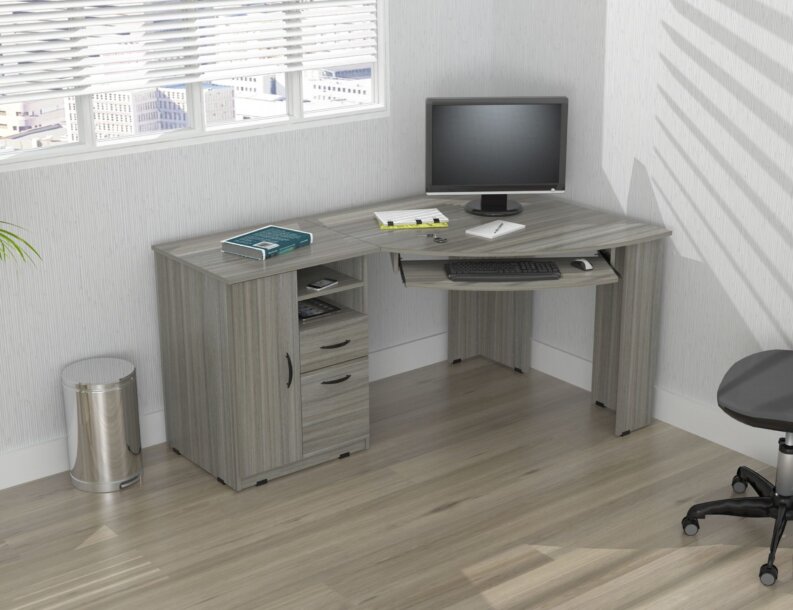 L Shaped Work Center by Inval® finished in a rich “Smoke Oak” laminates in durable melamine which is stain, heat and scratch resistant. Constructed from manufactured wood. This corner computer desk has a large work surface making it a perfect addition to your home office or office. It is finished on all sides and features an open storage compartment, one accessory drawer with a brushed metal handle and metal slides, as well as one file drawer with a brushed metal handle and full extension metal drawer glides. The file drawer can accommodate both letter and legal sized files. There is an ample CPU storage compartment positioned behind a door with brushed metal handle. Plastic sliders protect the unit and allow for easy mobility when cleaning or rearranging your room décor.