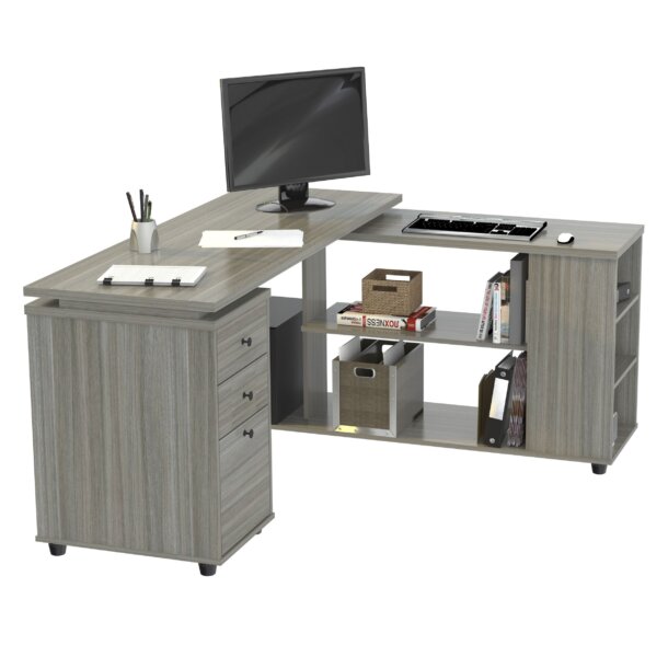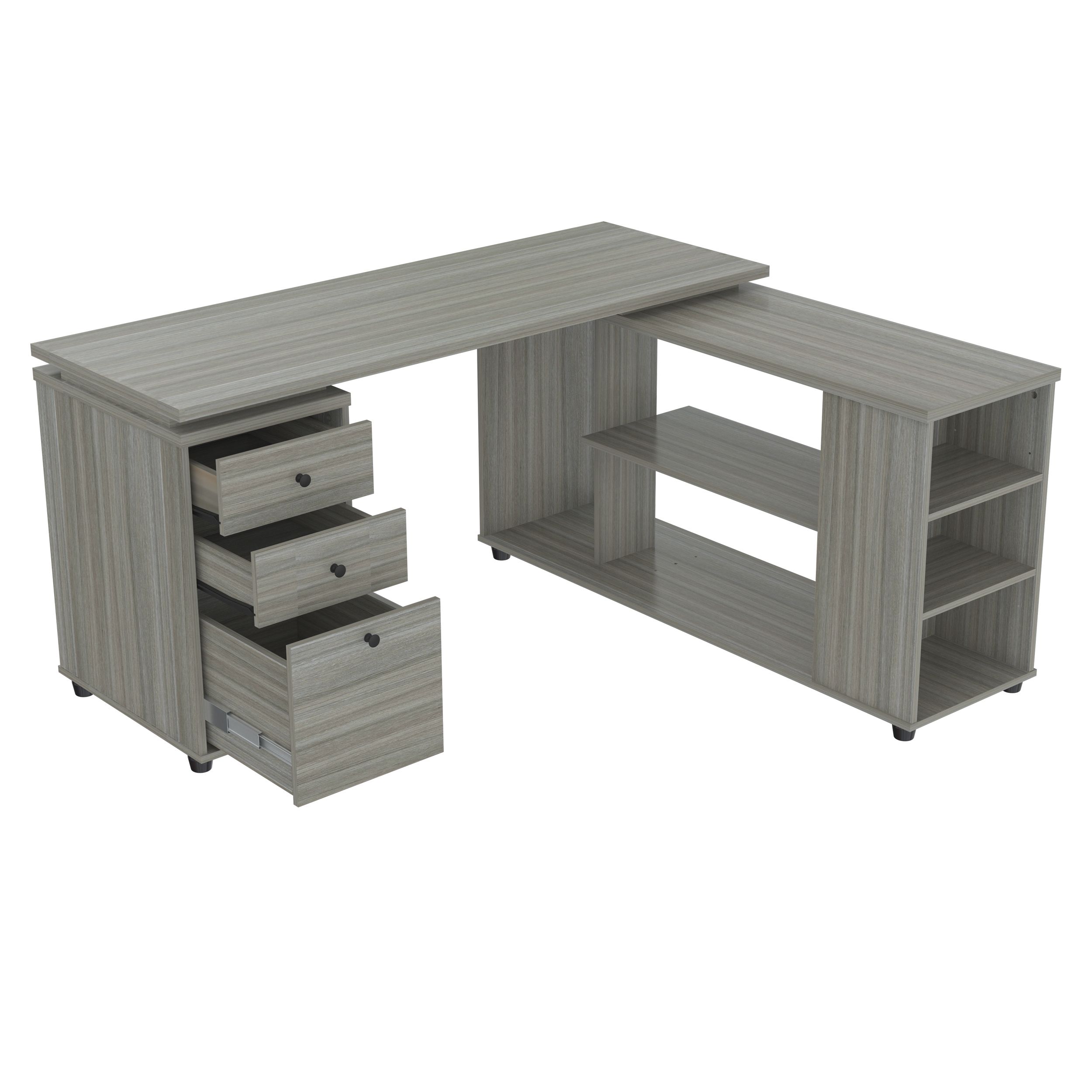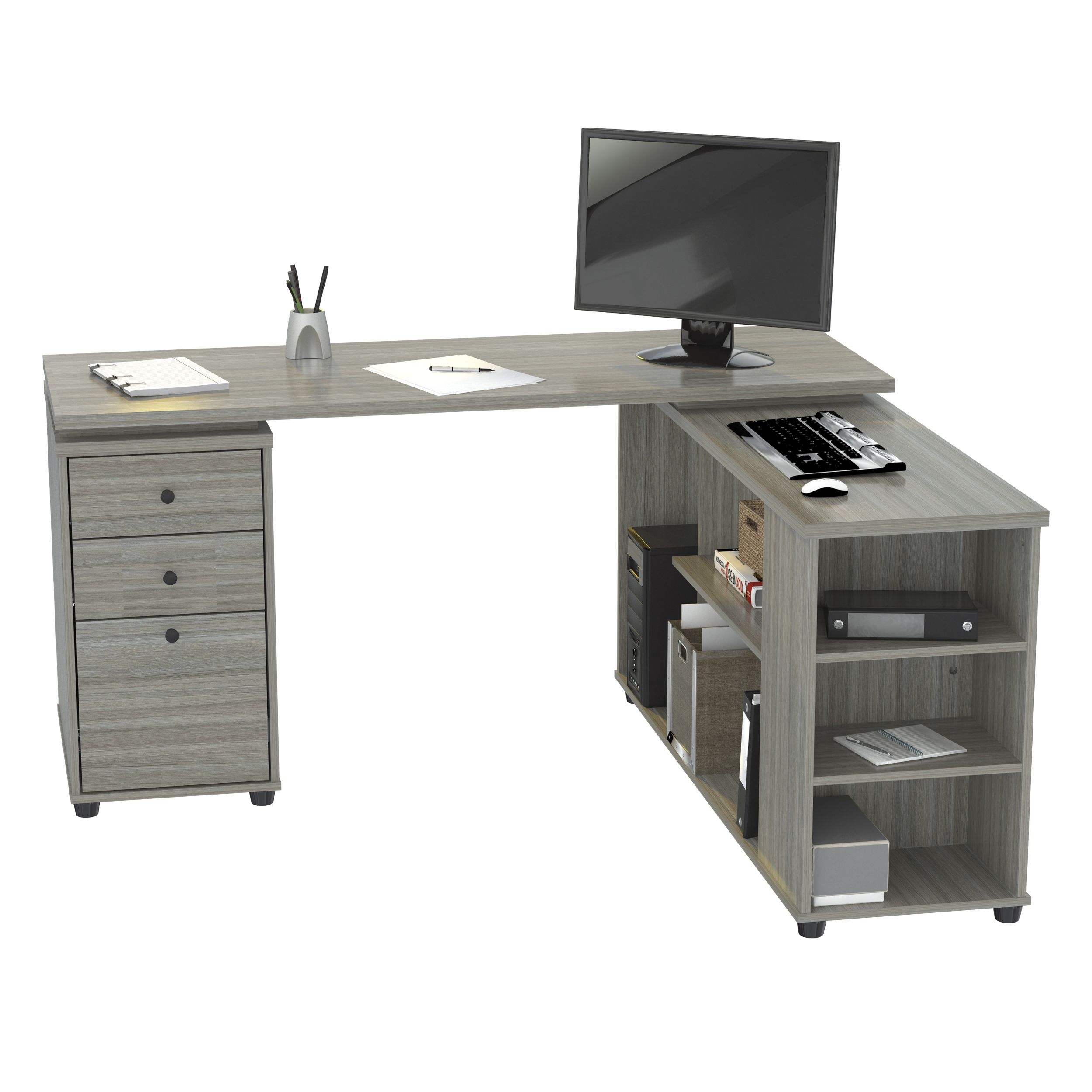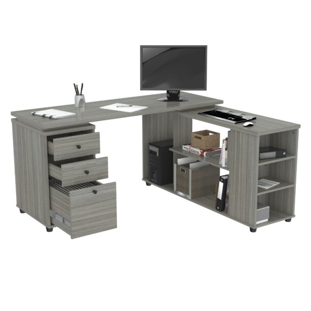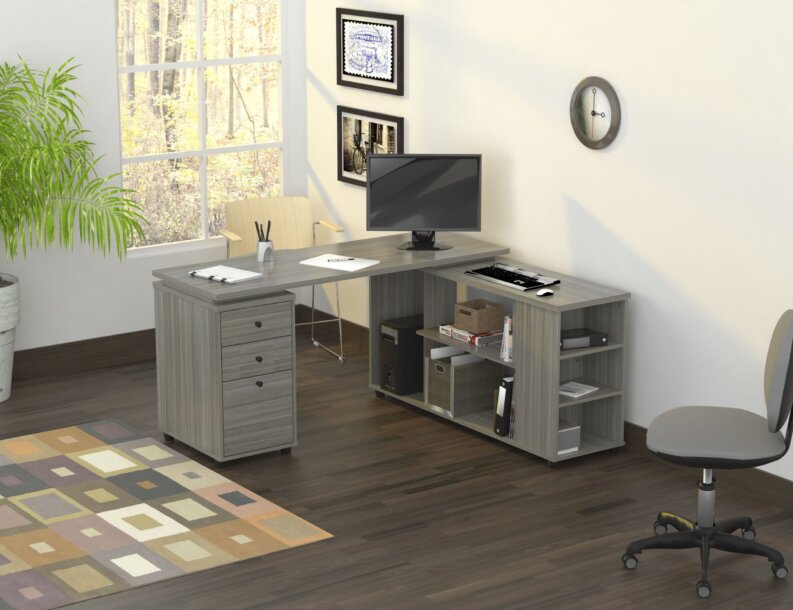 L Shaped Work Center by Inval® finished in a rich “Smoke Oak” laminates in durable melamine which is stain, heat and scratch resistant. Constructed from manufactured wood. This corner computer desk offers a spacious work surface making it a perfect addition to any home office or office. It has a 1” top with 1.5mm edge banding and it can be assembled in a left or right configuration. It features one file drawer with full extension metal drawer glides which accommodates letter or legal sized files, and two accessory drawers with brushed metal slides for storing supplies. All drawers have brushed metal knobs. The unit offers an ample work space, shelves for books, dedicated CPU storage, printer space and space for other accessories. Plastic sliders protect the unit and allow for easy mobility when cleaning or rearranging your room décor.