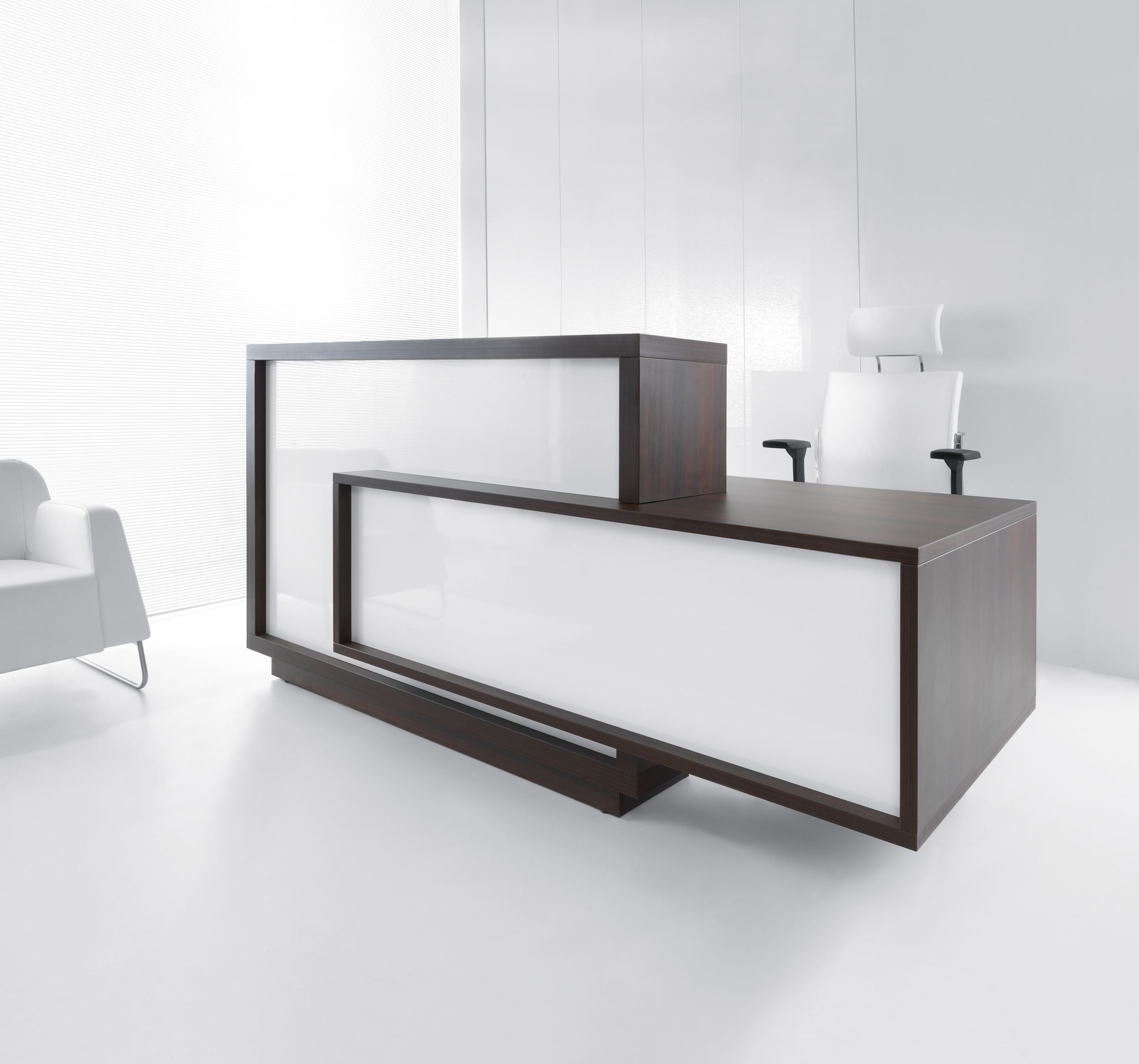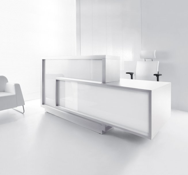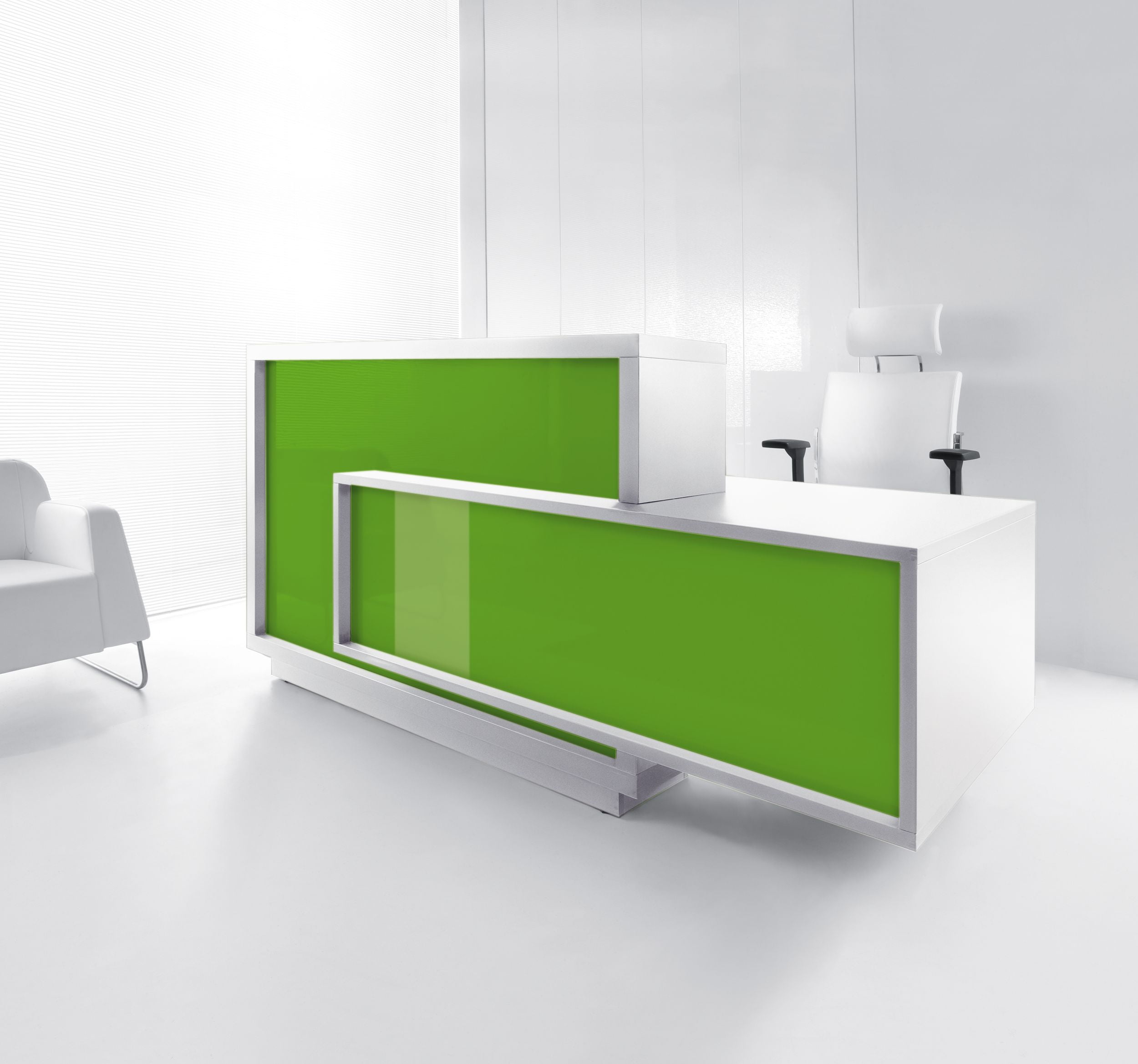 Unique, cubist shape of the reception desk makes the character of the room very expressive. Two overlapping rectangles available in four color variants – white, green, red and orange – create the front of the counter. Glitter of the frontal parts contrast with the matt body and the desk top which can be white or chestnut. Not so big body of Foro is extremely capacious and offers enough space for essential devices and stationery.