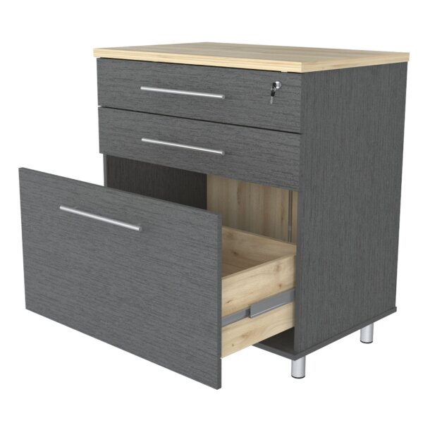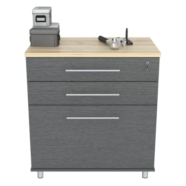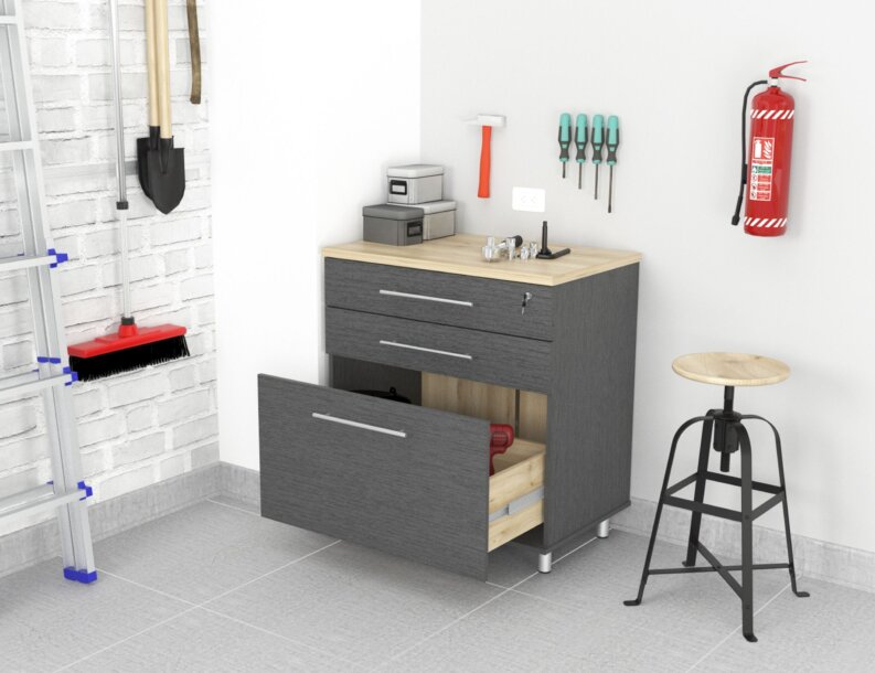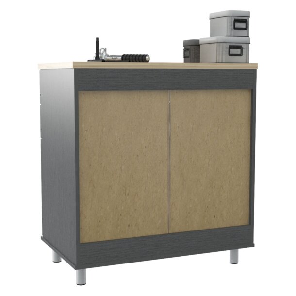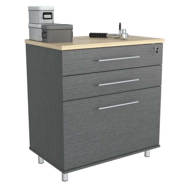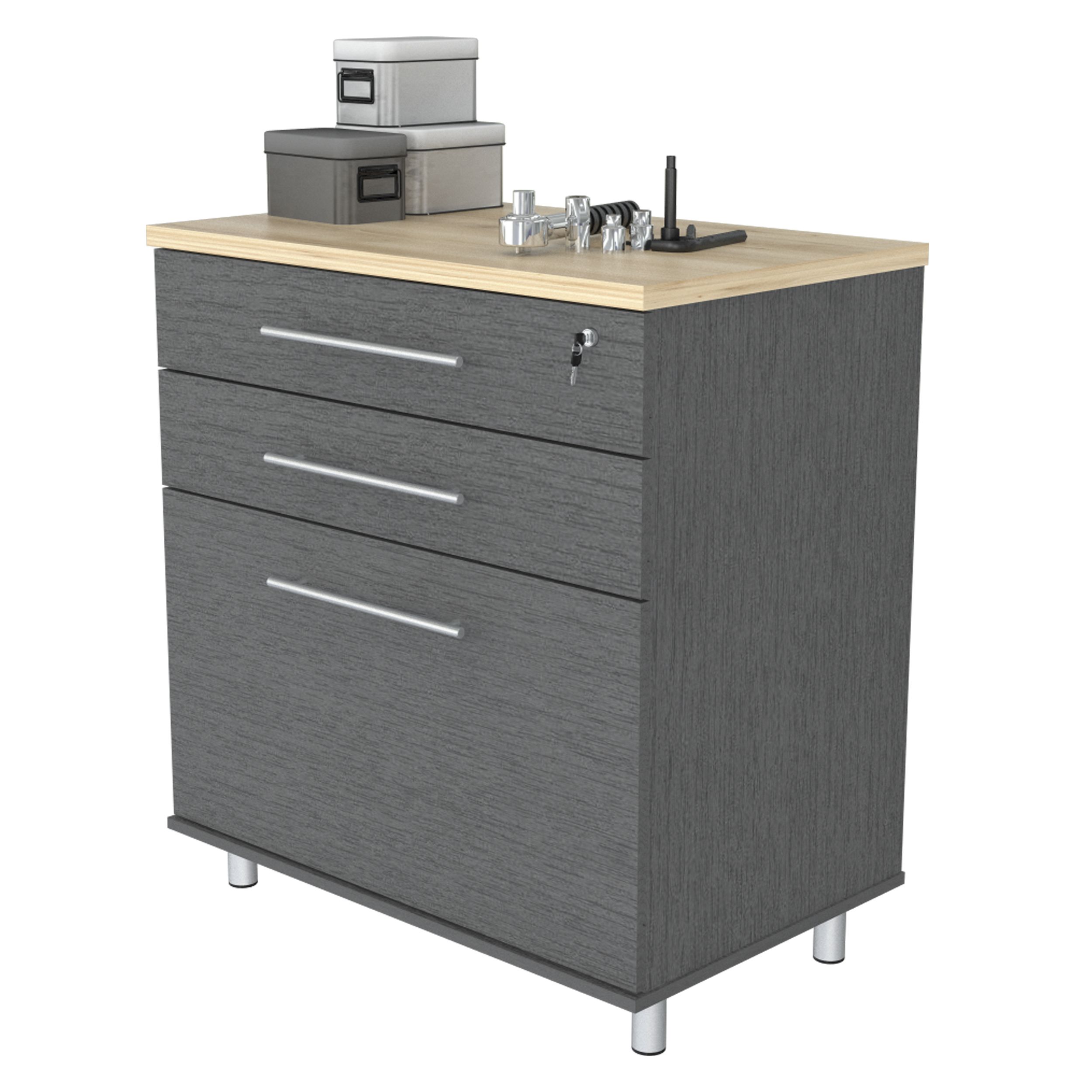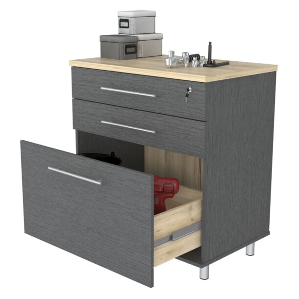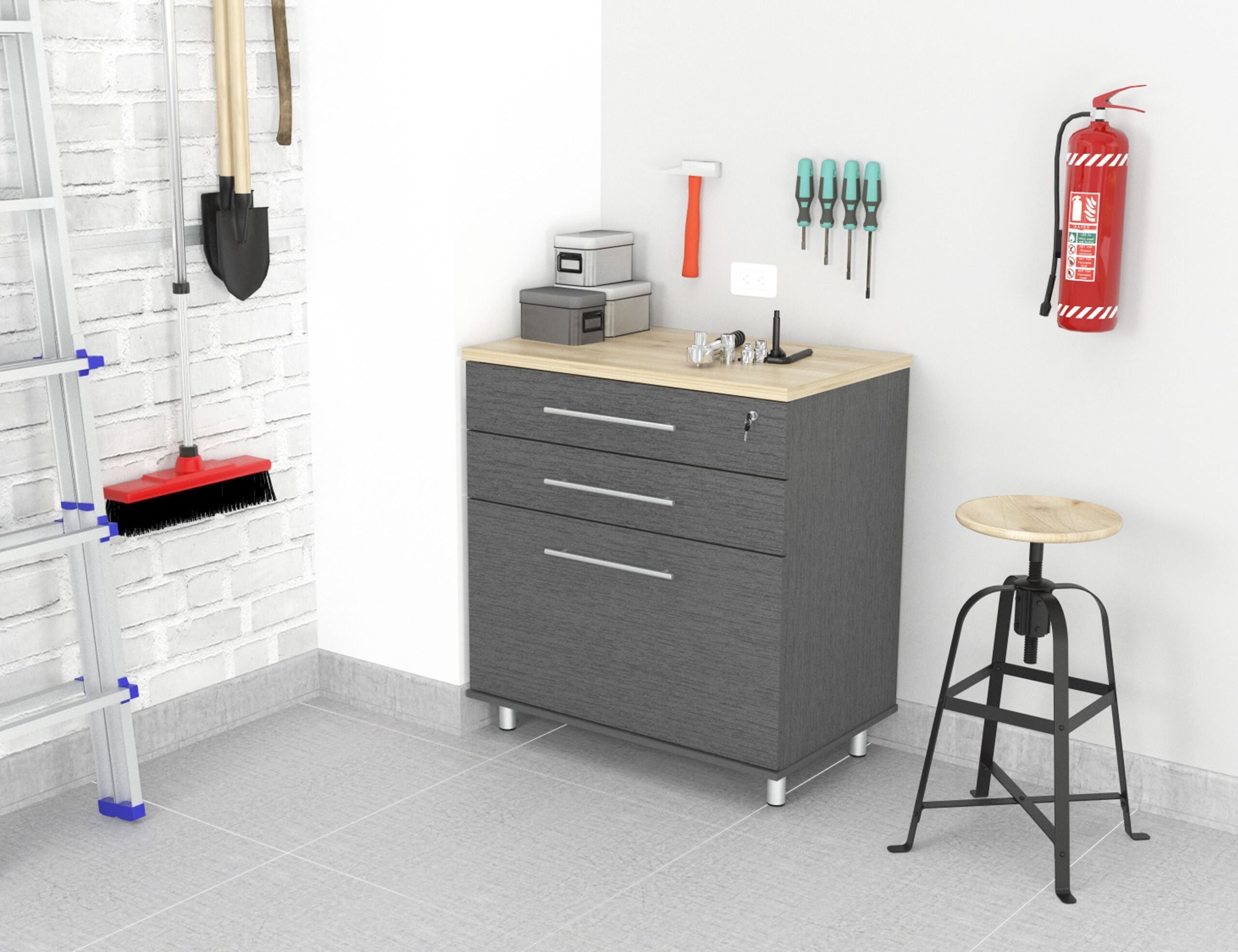Kratos™ Series Garage Storage Cabinet by Inval®, finished in a rich “Kromo/Maple” laminates in durable melamine which is stain, heat and scratch resistant. Constructed from industrial grade manufactured wood. This unit features one (1) large drawer and two (2) smaller drawers installed with metal drawer glides. A large work surface with plenty of space provides an ample work area for all your projects. The unit is conveniently equipped with adjustable, easy to level feet.