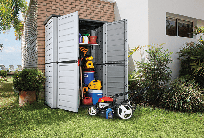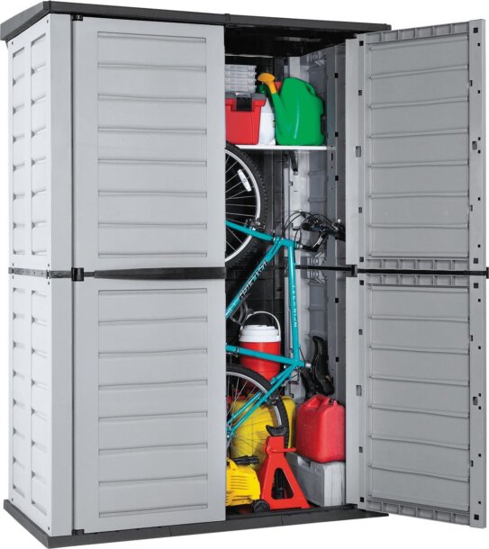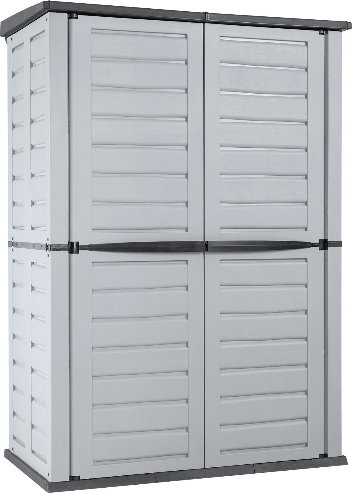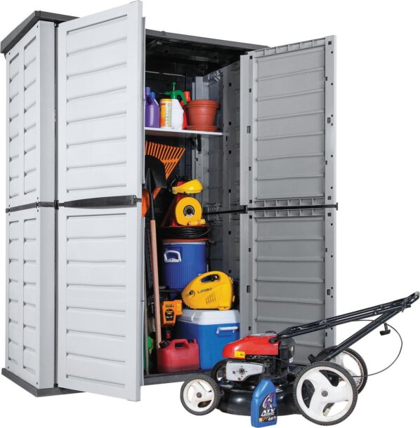 “RIMAX” Large Storage Shed. Manufactured in durable polypropylene resin. Great storage solution for outdoor use. It can be put on the patio, terrace or inside a garage. Ideal for storing garden machinery and tools, patio furniture, coolers, trash cans, bicycles and other outdoor items. Includes a plastic shelf for smaller and lighter items, that withstands up to 26.46 lbs (12 Kg.) Durable, maintenance-free. Easy to assemble, easy to clean. Unit is lockable (lock not included)
