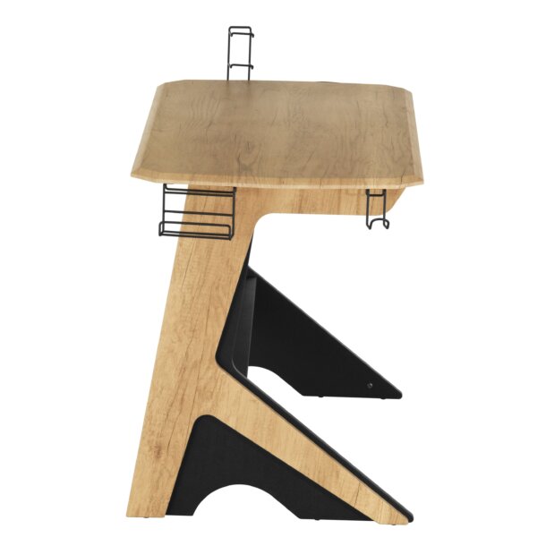 Effortlessly blending mid-century modern design aesthetics with rustic industrial elements, this charismatic Home Office Writing Desk lends curated appeal to your home office ensemble. Crafted from engineered wood, with a natural wooden look veneers, it can turn any area of your home into a sleek workspace. It has a 2-tier accessory rack, accessory holder, standard size, and large size cupholder and headphone holder that can be installed on either side while keeping accessories within reach. There is a bottom shelf that helps to keep the printer and speakers organized. This desk showcases a streamlined durable MDF frame with added two-tone sides with a classic touch. It offers plenty of space for your laptop, one or two monitors, and favorite desktop knickknacks. Color: Pine