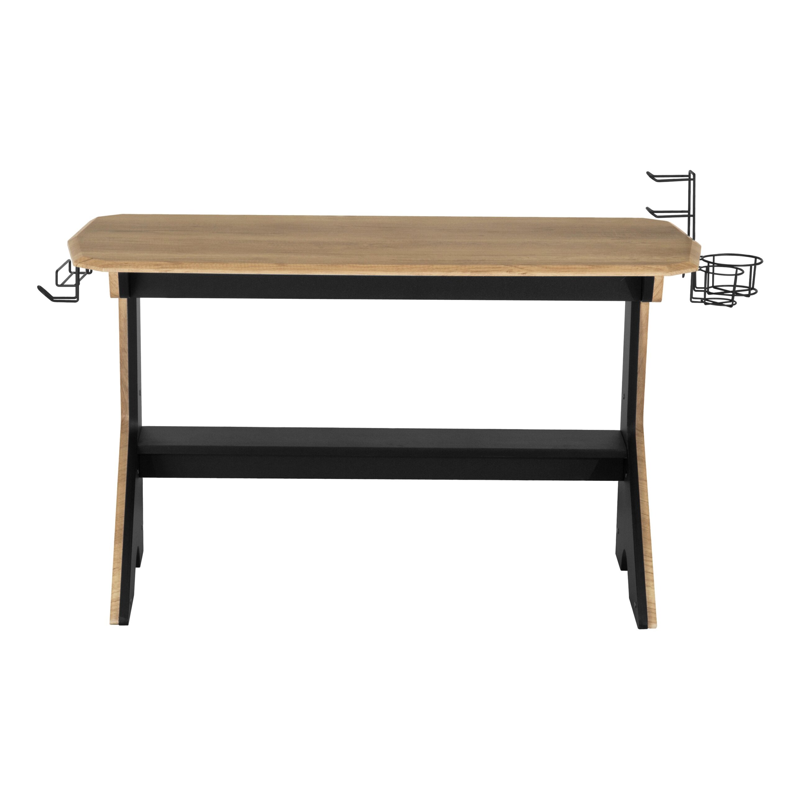 Effortlessly blending mid-century modern design aesthetics with rustic industrial elements, this charismatic Home Office Writing Desk lends curated appeal to your home office ensemble. Crafted from engineered wood, with a natural wooden look veneers, it can turn any area of your home into a sleek workspace. It has a 2-tier accessory rack, accessory holder, standard size, and large size cupholder and headphone holder that can be installed on either side while keeping accessories within reach. There is a bottom shelf that helps to keep the printer and speakers organized. This desk showcases a streamlined durable MDF frame with added two-tone sides with a classic touch. It offers plenty of space for your laptop, one or two monitors, and favorite desktop knickknacks. Color: Pine