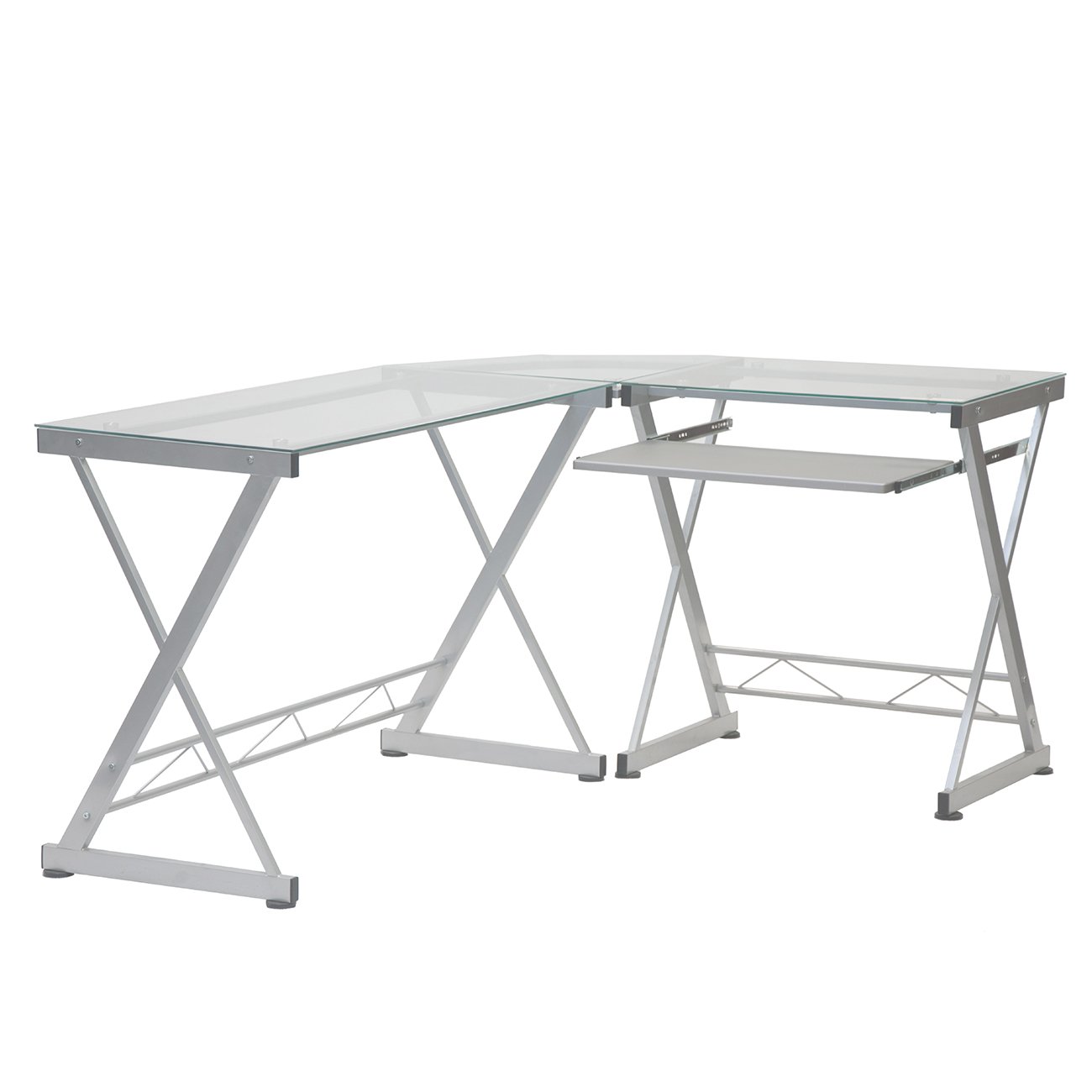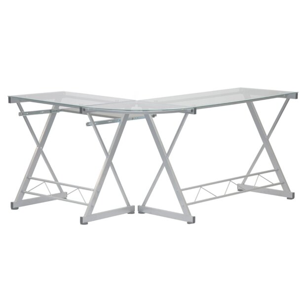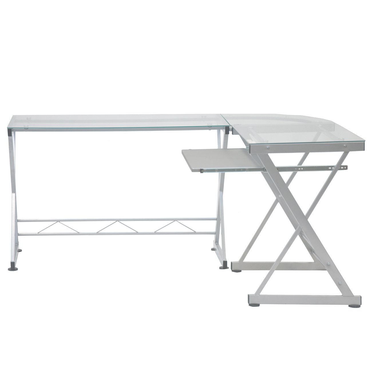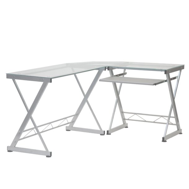 This L-shaped ReversibleGlass Corner Desk embodies the essence of modern design with a minimalist yet functional design that can be configured to your preference, with the long and short sides reversible on the left or right hand. It is made with a heavy-duty 8 mm tempered safety glass desktop, scratch-resistant powder-coated steel frame. Its slide-out keyboard shelf equipped and is made of MDF wood laminate. The square glass desktop panels can each hold up to 66 lbs, the corner glass desktop panel have a 44 lbs weight capacity, and the keyboard shelf can hold up to 22 lbs. Color: Clear