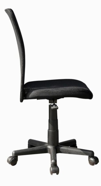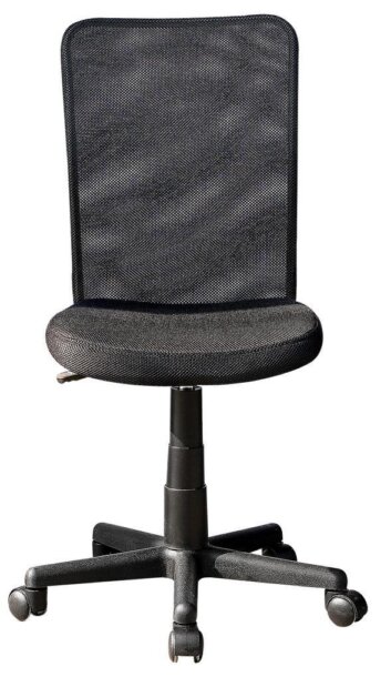 The Mesh Chair features a breathable mesh back support, a contoured fabric seat cushion, and a pneumatic seat height adjustment lever that provides a 4.5 inch seat height range, Dual wheel non-marking casters and a 5-star nylon base for a durable, stable mobility. Fits people up to 150 Lbs. It is both lightweight and compact in size. Color: Black.