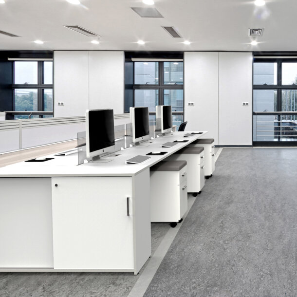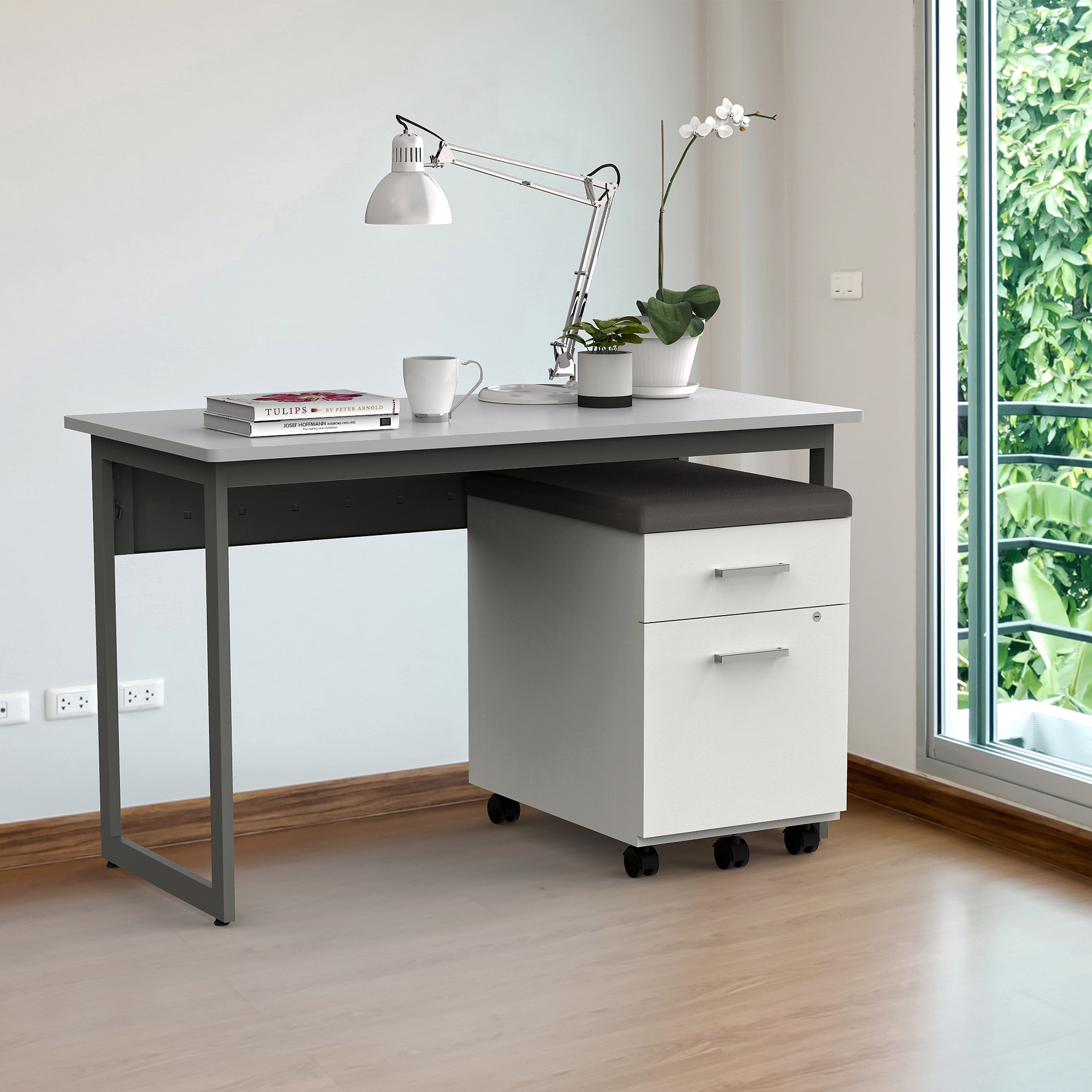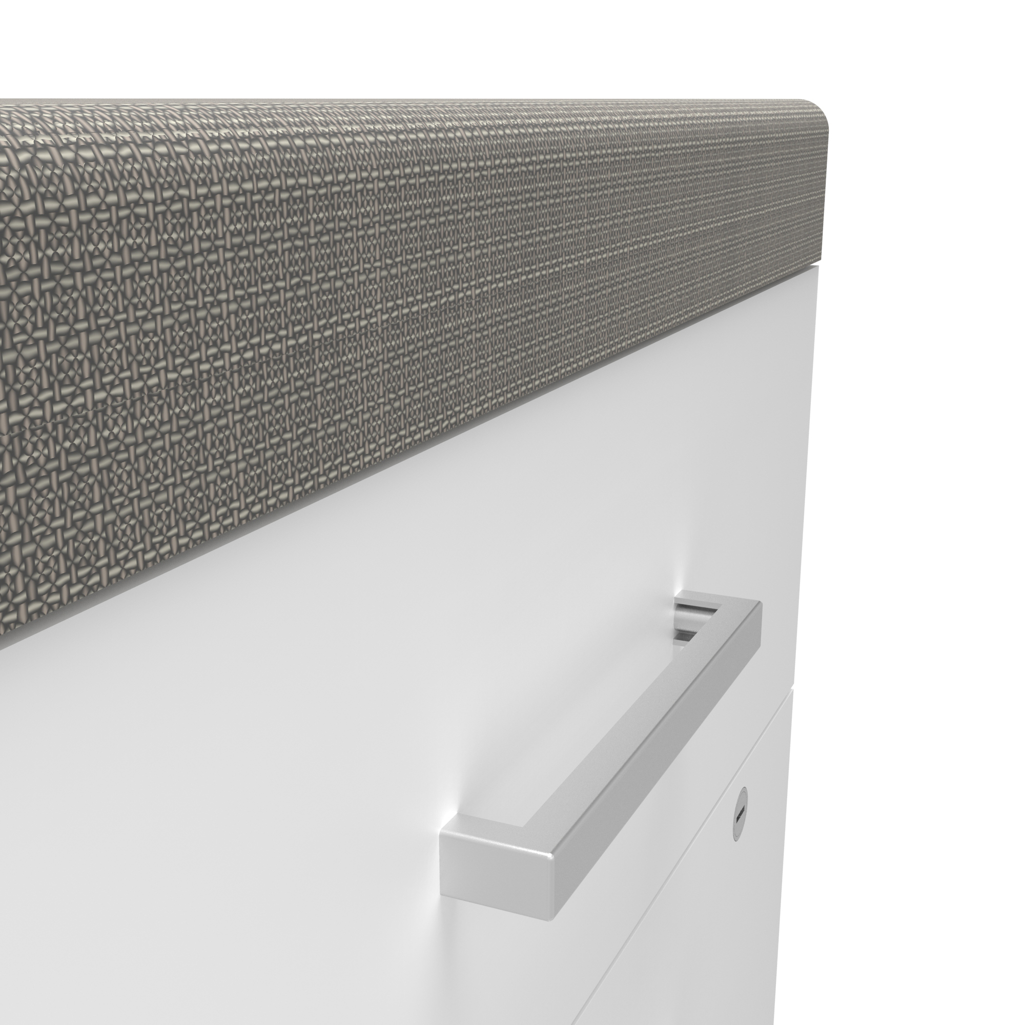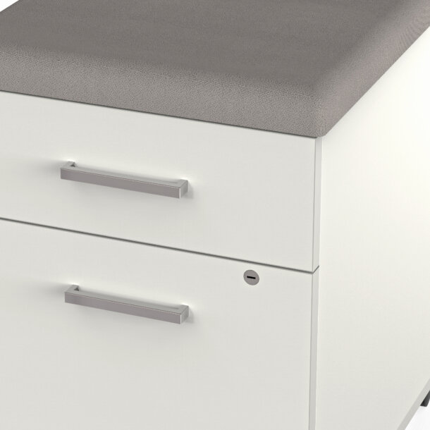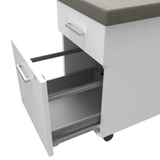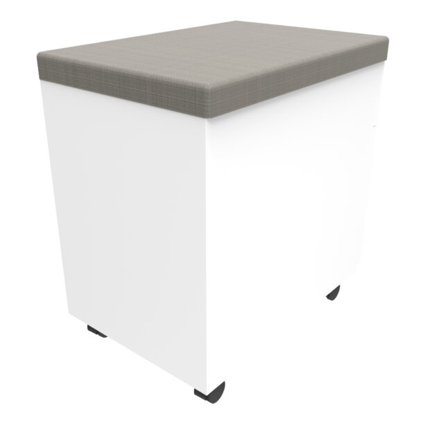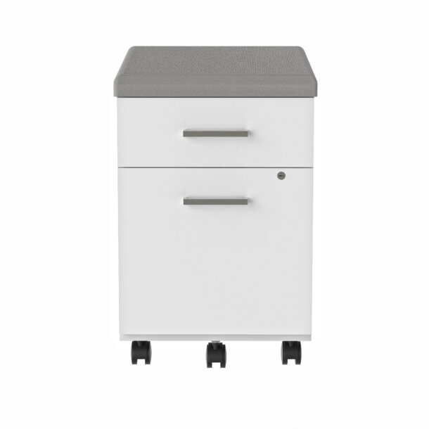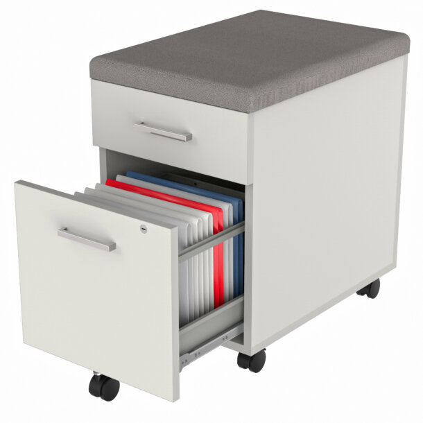 - This Mobile Pedestal File with Cushion Top has White Thermofused laminated wood body and gray Chusion Top