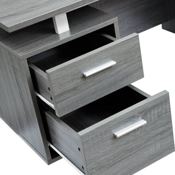 Cubism is sleek and contemporary, this desk is the perfect combination of function, durability and design in a modern form. With clean lines, a floating top work station and sleek track metal legs, this desk will add pizzazz to any home office. Featuring two storage drawers and a file cabinet to help keep you organized with a large desktop surface to provide plenty of room for all your hardware and working needs. Color: Grey