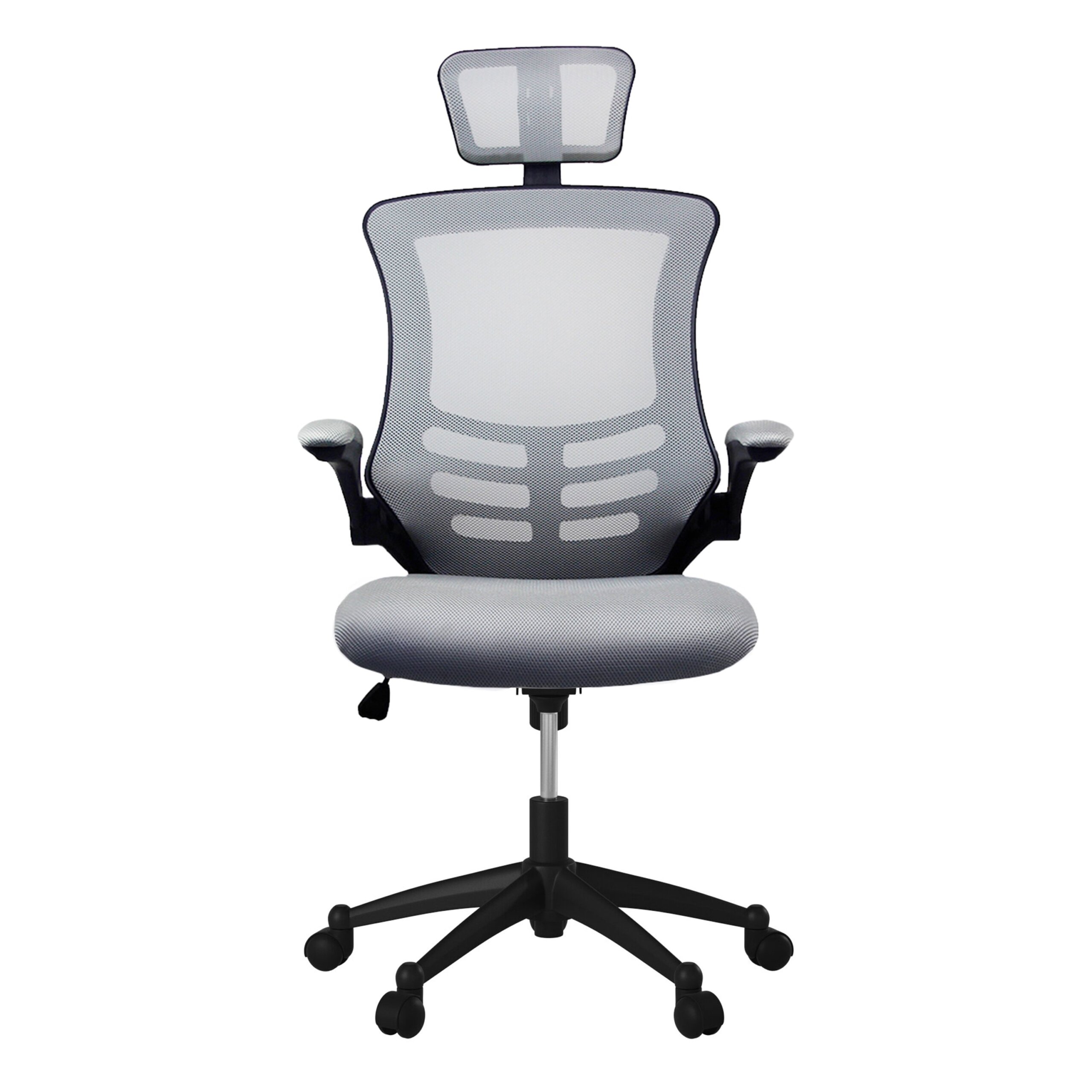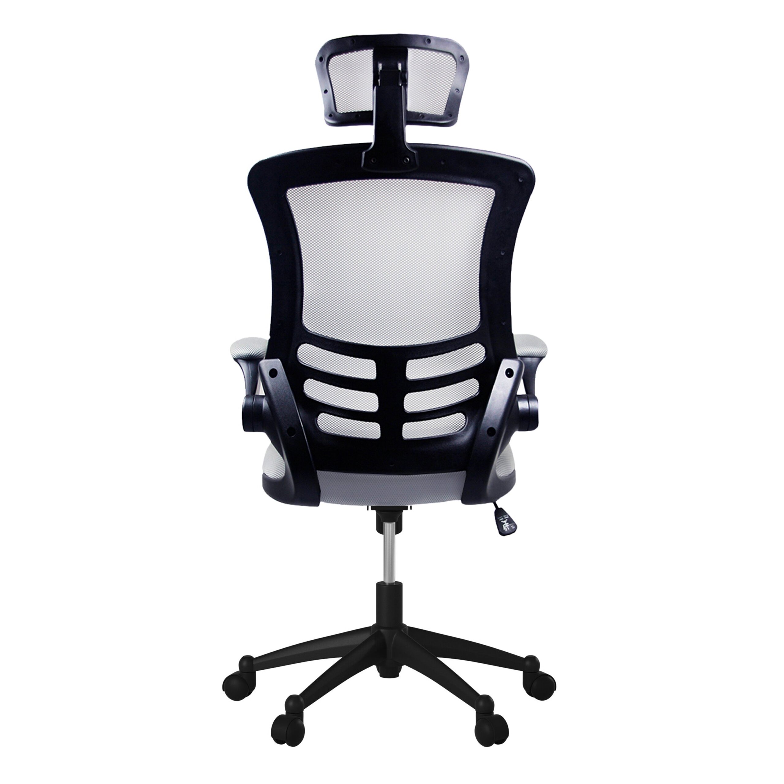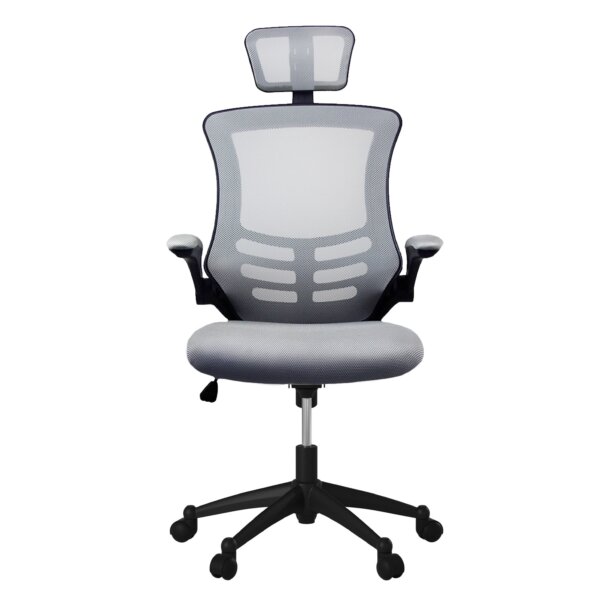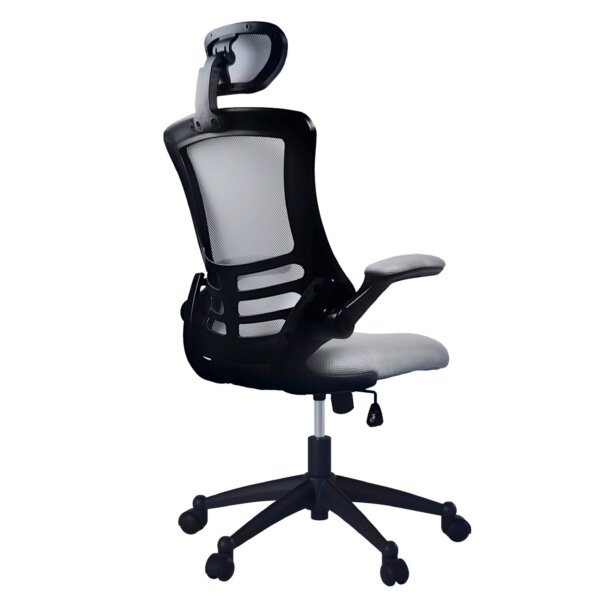 The Executive High Back Mesh Chairs has a sleek, contemporary design and features breathable open mesh back support, a contoured mesh fabric seat cushion, height-adjustable headrest, padded flip-up armrests. The back has a locking lever and a tension control knob. Includes dual non-marking casters and 5-star heavy-duty nylon base, which provides stable mobility. Can fit people up to 220 Lbs. Ready and easy to assemble. Color: Black & Silver Grey