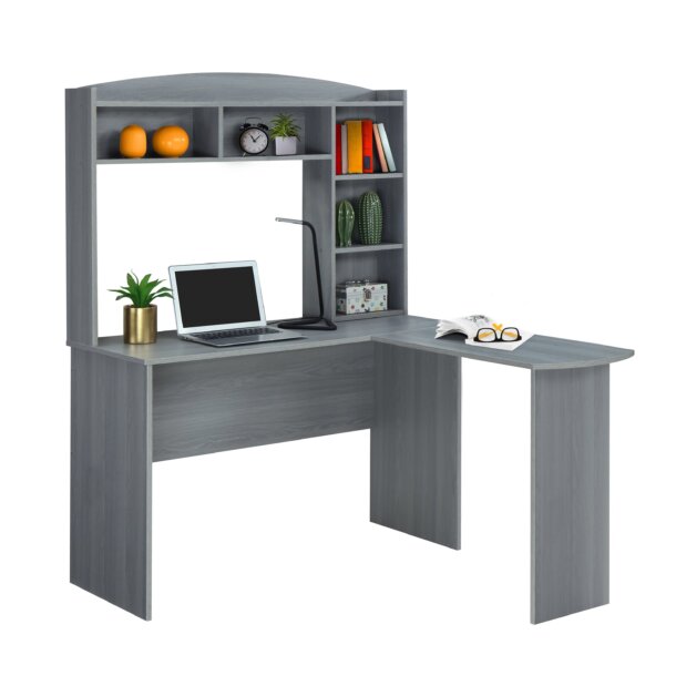 Create a beautiful home office space with the Modern L-Shape Desk. The desk surface has plenty of room for monitors, laptops, printer plus any home-office essentials, and extra space to spread out comfortably. Crafted from wooden panels with a laminated surface with woodgrain grey finish, the L-Shaped Desk makes an attractive addition to your existing home furnishings. It has two open side storage shelves towards the right end of the desk for easy access to tablets, letters or even files within reach when not in use to keep the surface clear from clutter. The desktop surface is not reversible, only as shown in the image. Color: Grey.