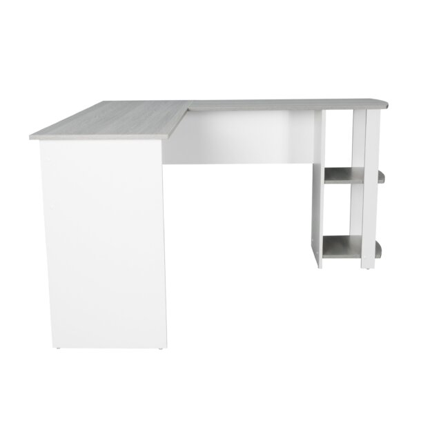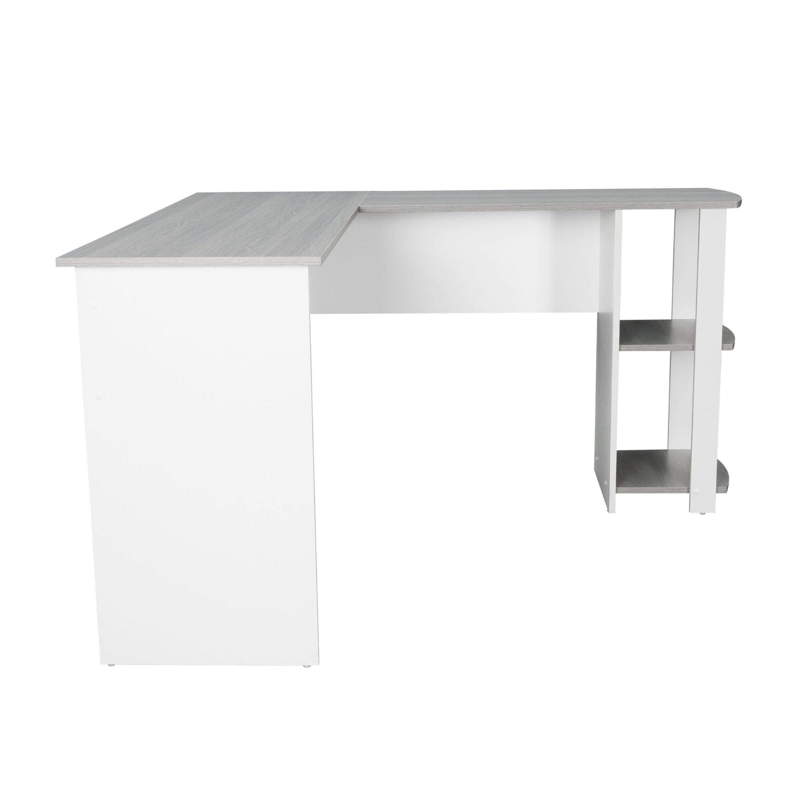 Create a beautiful home office space with the Modern L-Shape Desk. The desk surface has plenty of room for monitors, laptops, printer plus any home-office essentials, and extra space to spread out comfortably. Crafted from wooden panels with a laminated surface with woodgrain grey finish, the L-Shaped Desk makes an attractive addition to your existing home furnishings. It has two open side storage shelves towards the right end of the desk for easy access to tablets, letters or even files within reach when not in use to keep the surface clear from clutter. The desktop surface is not reversible, only as shown in the image. Color: Grey.