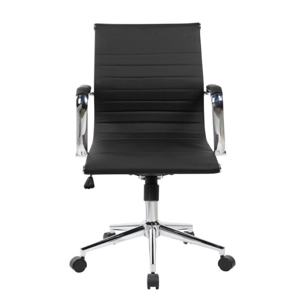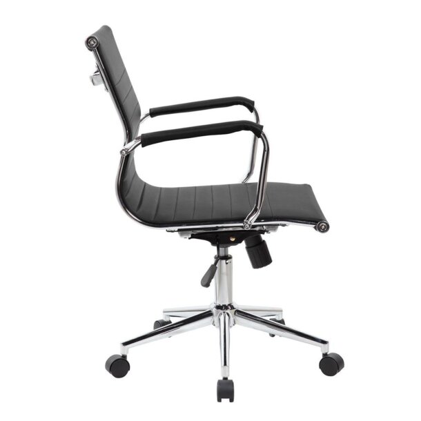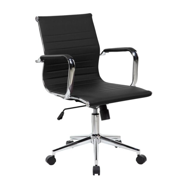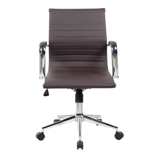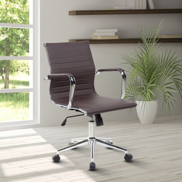 This elegant and modern Executive Office Chair will add an upscale appearance to your office with its attractive stitched seat and back. Made of Techniflex upholstery with chrome steel base and chrome arms rests, the comfortable seat has built-in lumbar support and has an iconic ribbed design; features a chrome base, pneumatic seat height adjustment, armrests and locking tilt control with tension knob and comfortably fits users up to 200 Lbs. Color: Black & Chocolate