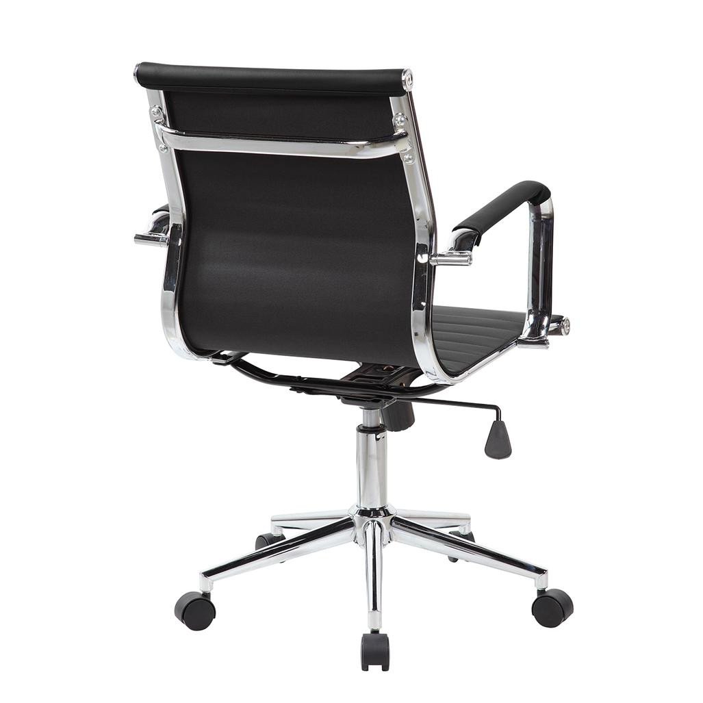 This elegant and modern Executive Office Chair will add an upscale appearance to your office with its attractive stitched seat and back. Made of Techniflex upholstery with chrome steel base and chrome arms rests, the comfortable seat has built-in lumbar support and has an iconic ribbed design; features a chrome base, pneumatic seat height adjustment, armrests and locking tilt control with tension knob and comfortably fits users up to 200 Lbs. Color: Black & Chocolate
