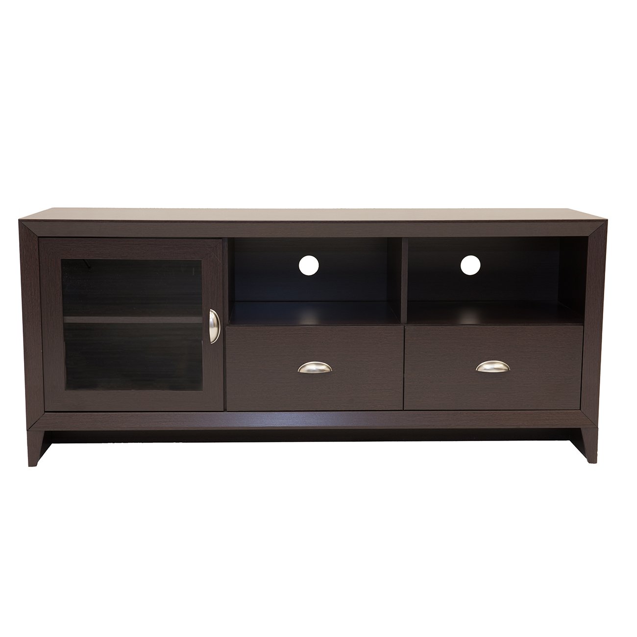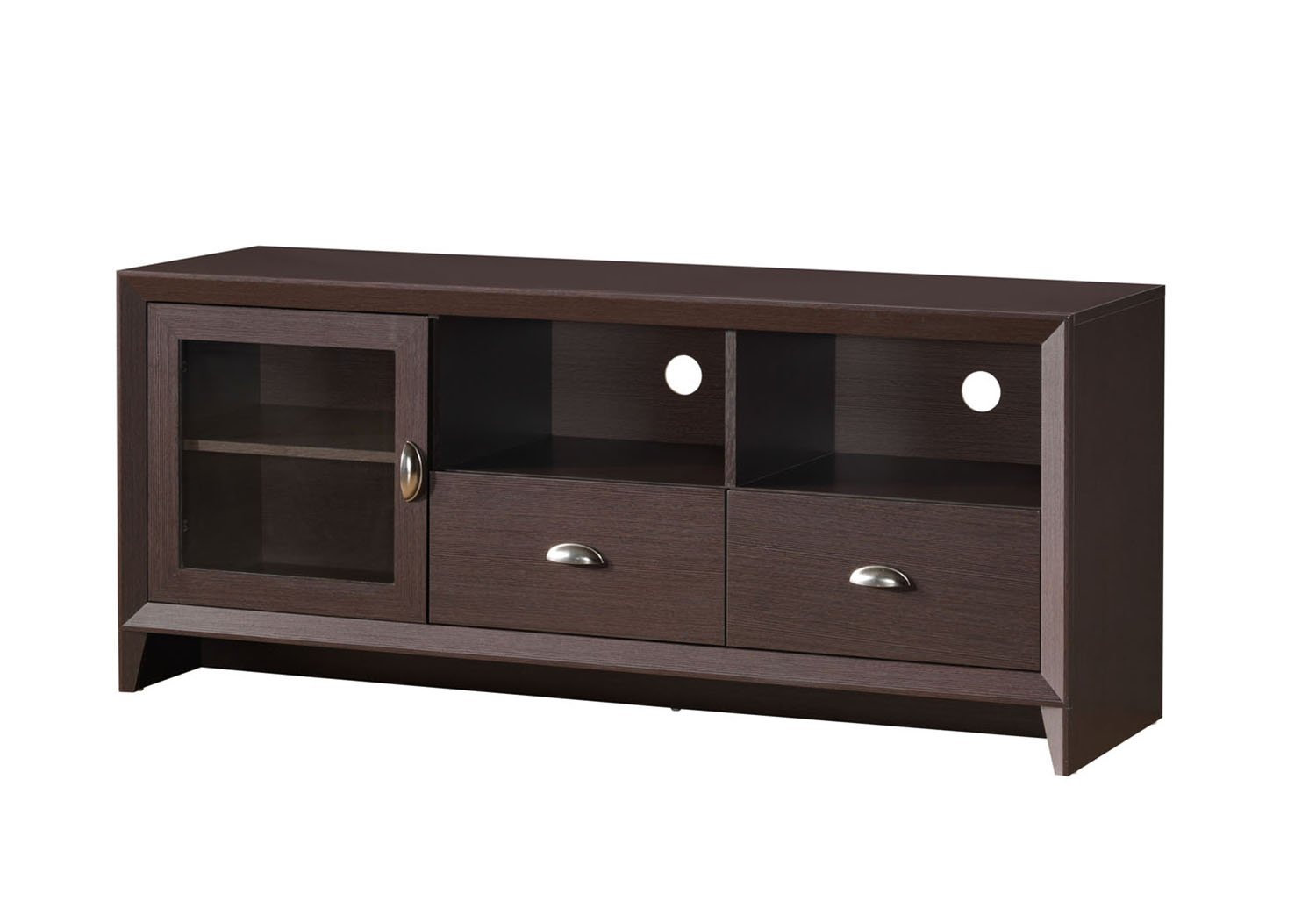 This TV Stand, for TVs up to 60″, is designed to fit any bedroom or family room. It includes one storage cabinet with a glass door and two drawers for additional storage space. The TV stand also features two open shelves to help store your electronics and organize your cords with a back panel opening. The cabinet is made of compressed wood that is resistant to scratches with a laminate surface. Important: Holds TV’s up to 60″ when TV is measured diagonally. The actual unit is 55″ wide but TV overhang on either side is suitable. Weight capacity 120 lbs. Color: Wenge